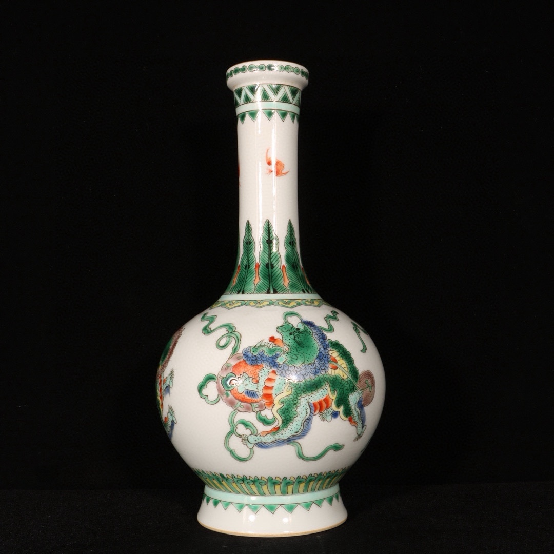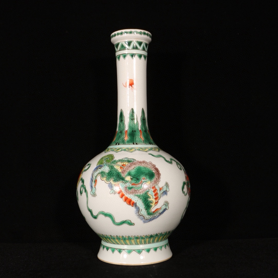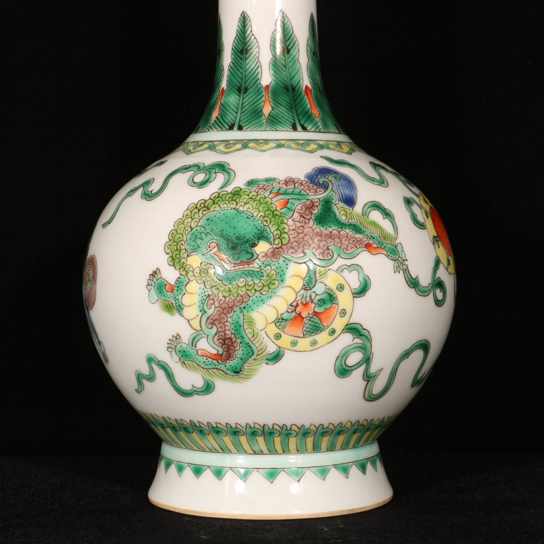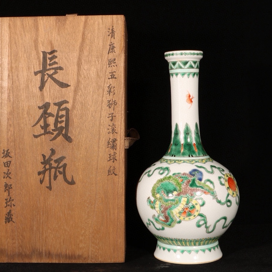 秘藏 清時代 康熙年製 五彩獅子 転紫陽紋 長頸瓶 時代物 汝窯 唐物 陶磁器 共箱付き 中国美術 高さ28 cm 直径14 cm 古物保証 819