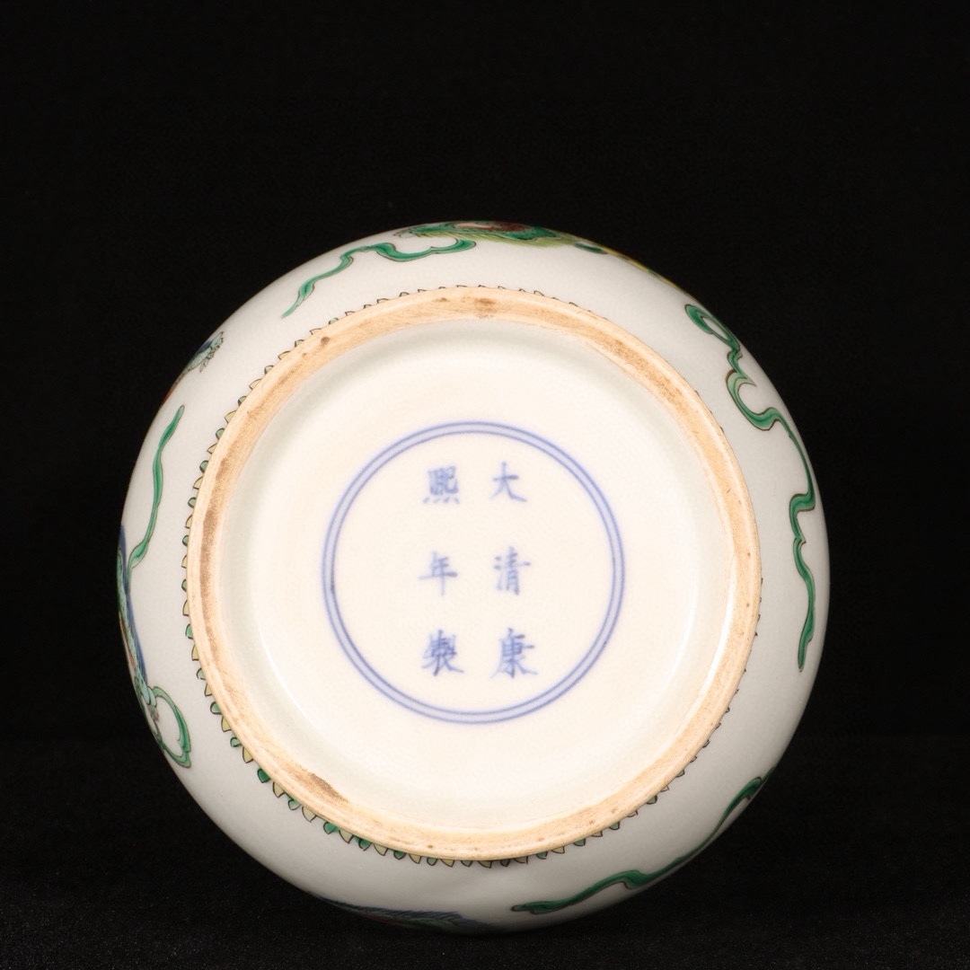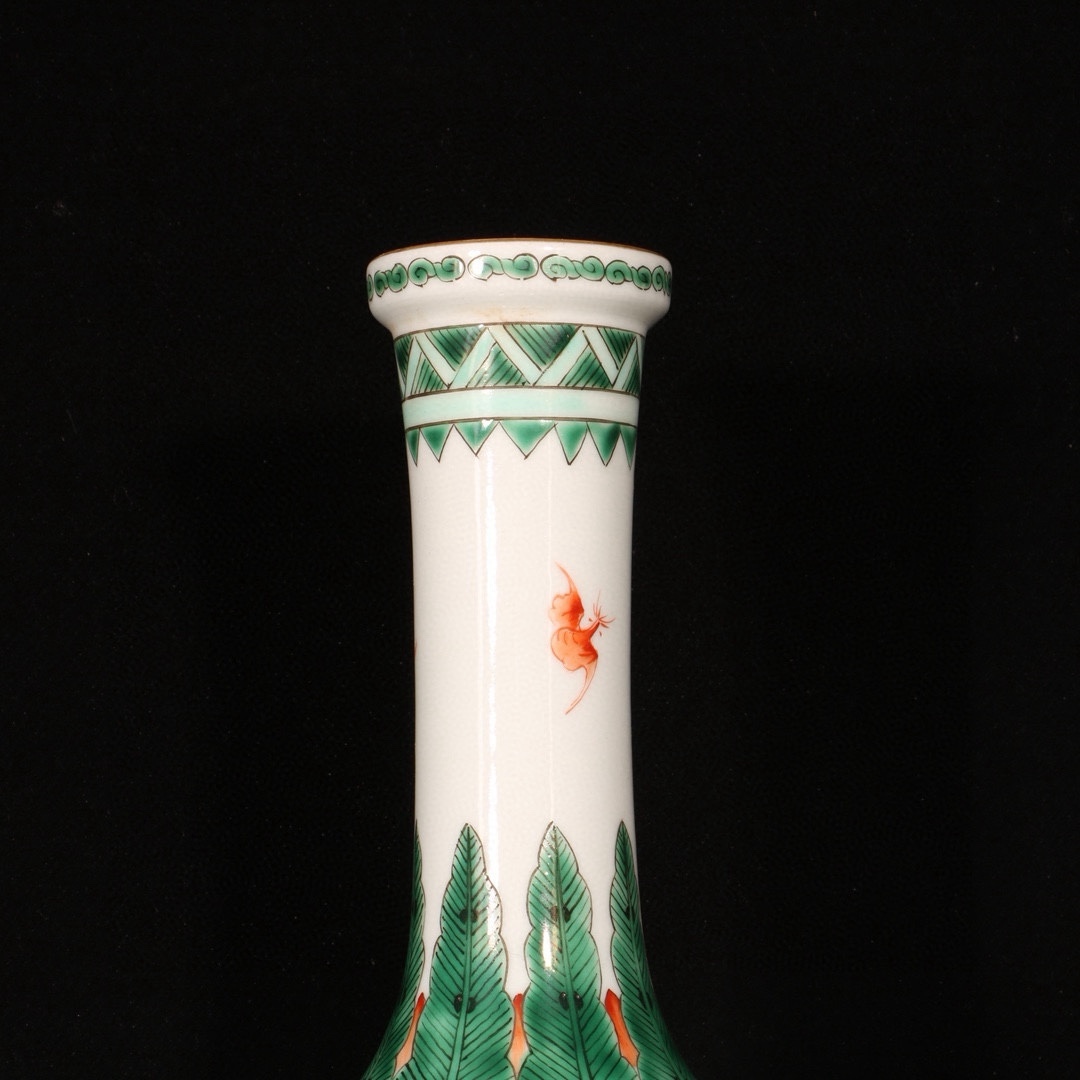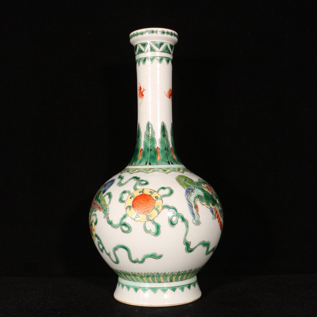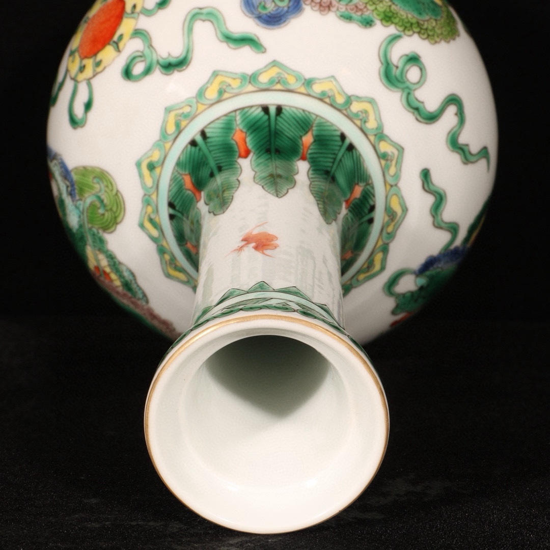 秘藏 清時代 康熙年製 五彩獅子 転紫陽紋 長頸瓶 時代物 汝窯 唐物 陶磁器 共箱付き 中国美術 高さ28 cm 直径14 cm 古物保証 819