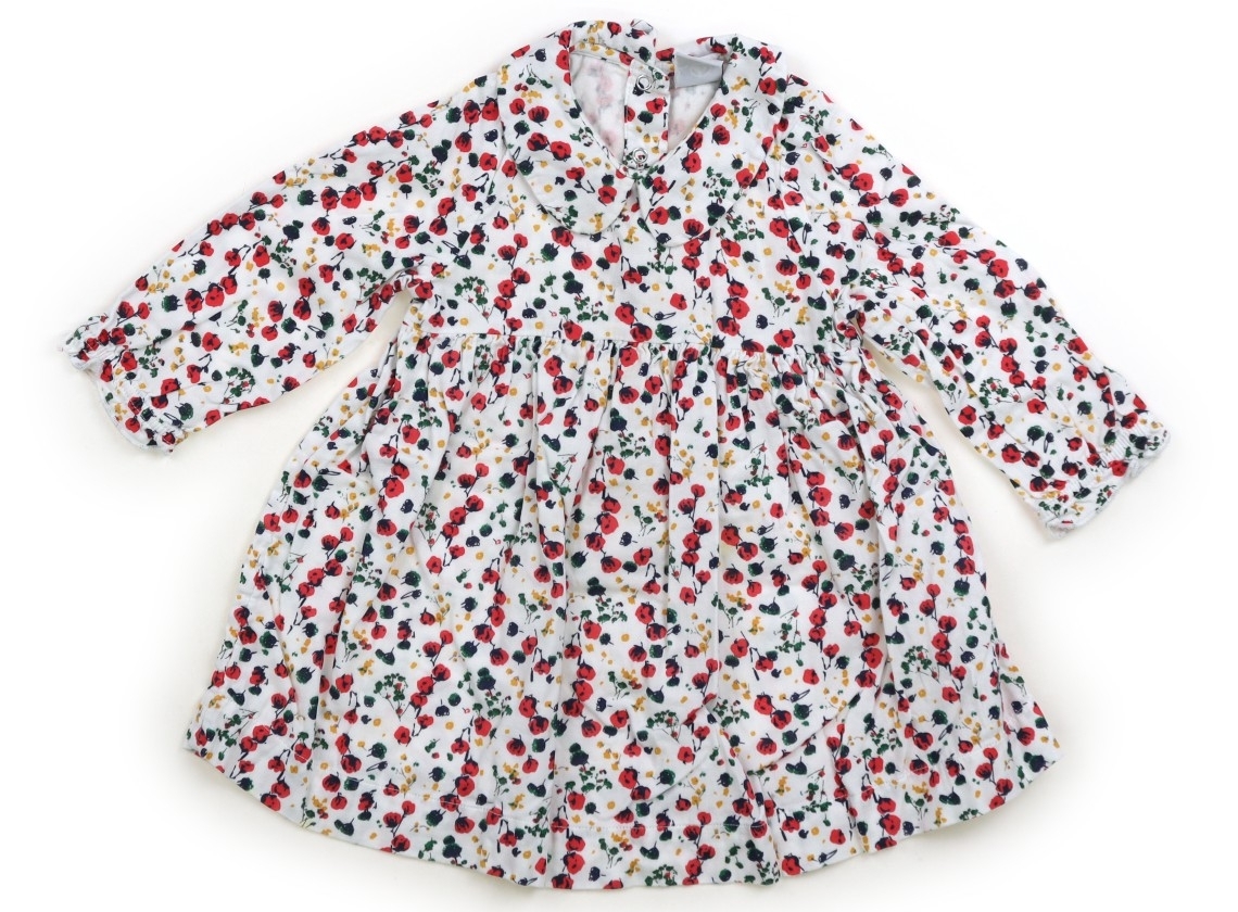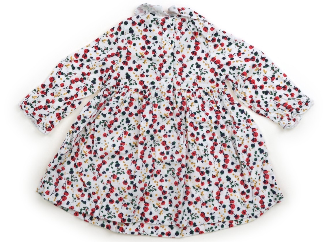 実際のサイズ表記は12m/74cmです。綿100%の布帛素材。裏地なし。洗いざらし感あり。衿元薄汚れあり。前身頃のスカート部分に茶色いシミがいくつか見受けられます。