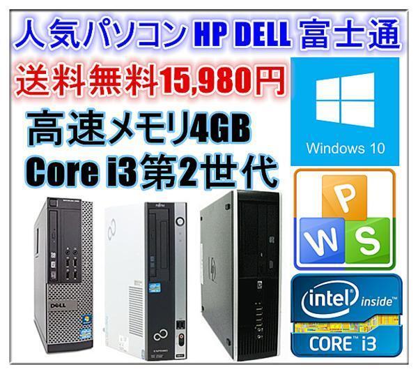 中古パソコン 正規Windows 10 64bit Officeソフト付 人気パソコン HP DELL 富士通 Core i3 2100-3.10GHz〜 メモリ4G HD250GB DVDドライブ