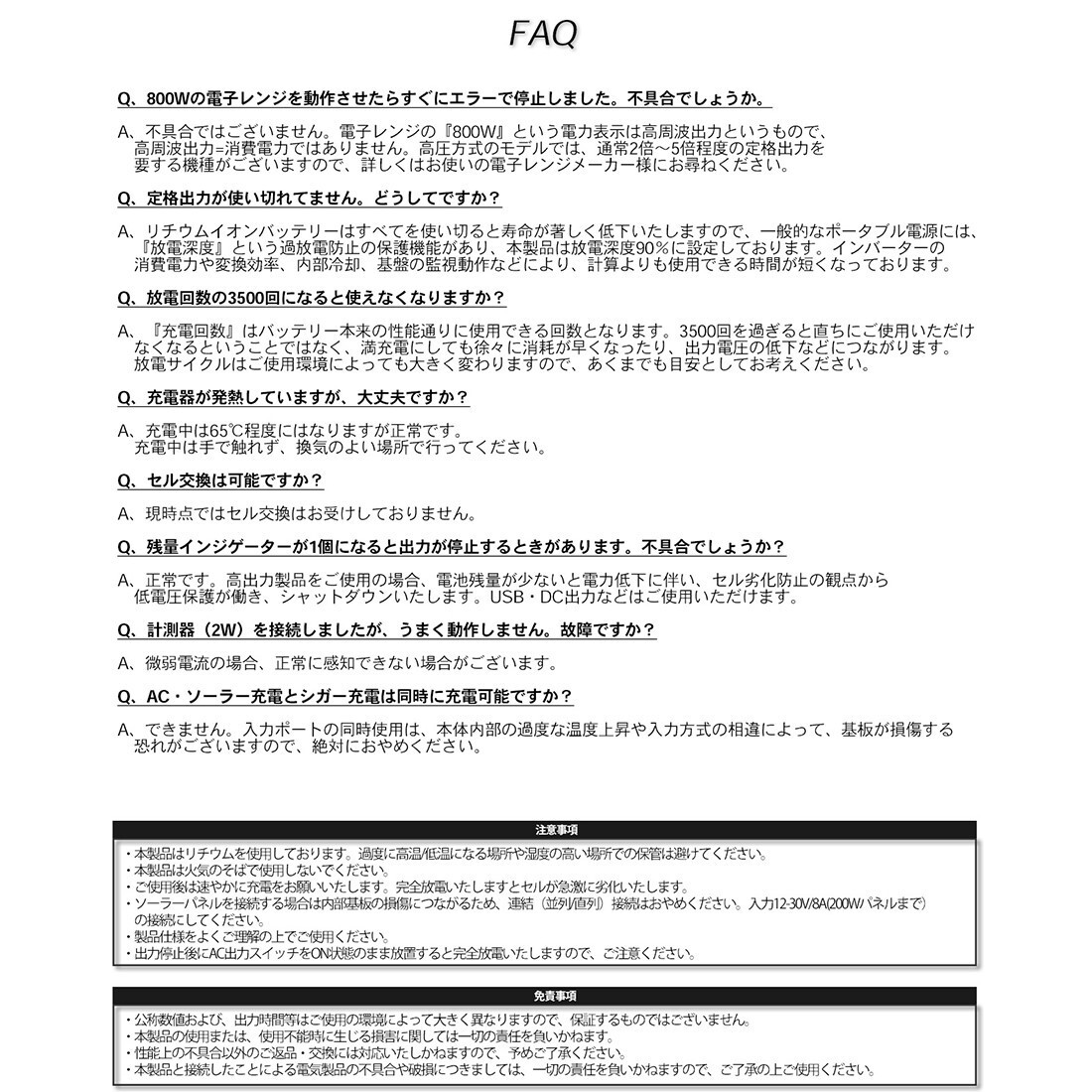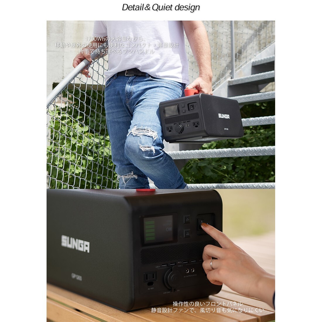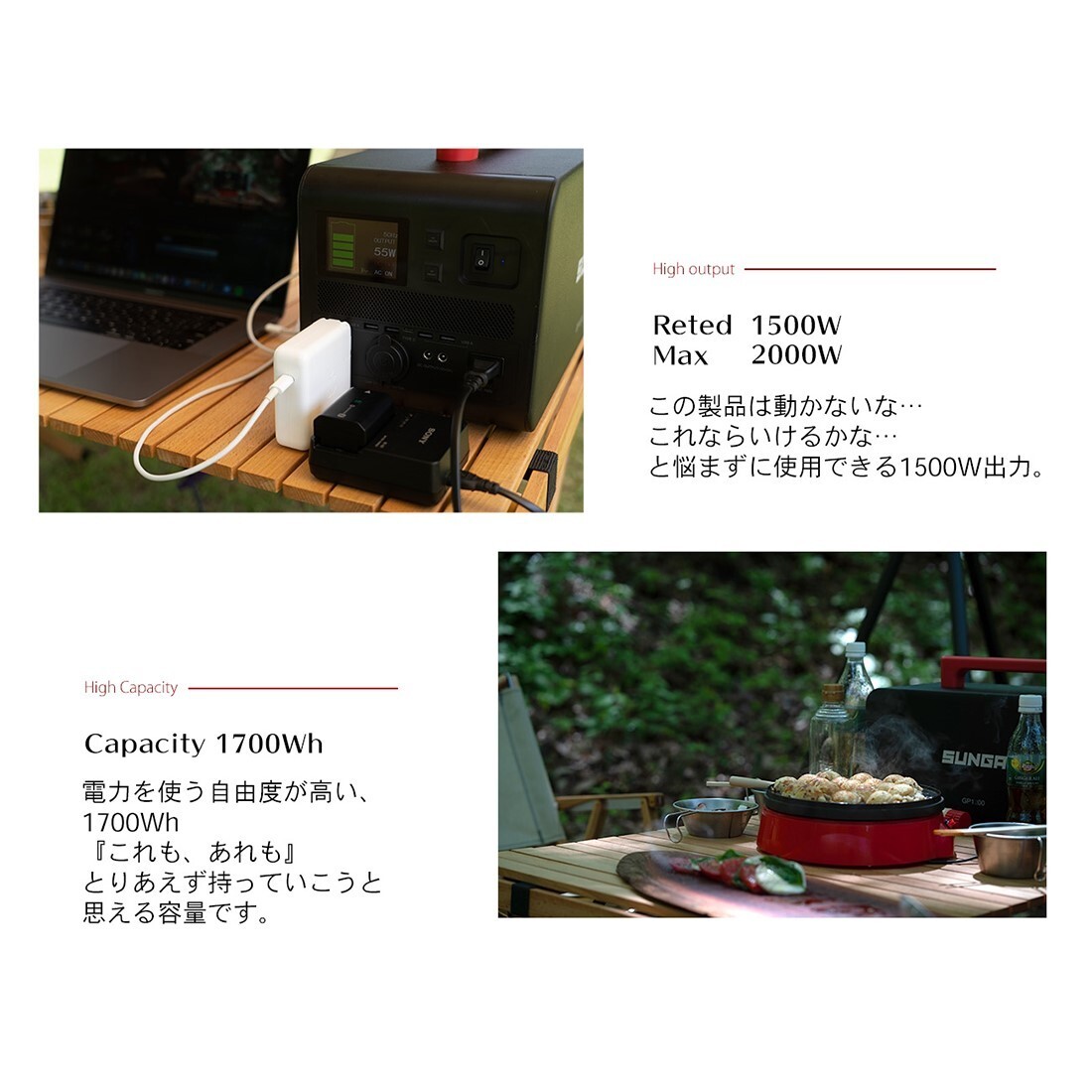 型番:GP1500 電池容量:1700Wh(532Ah) 重量:19.6kg 充電時間:約8.5時間 素材:アルミニウムボディ サイズ:480×190×238mm 電池種別:LiFePO4リン酸鉄リチウムイオン AC入力:AC100-240V 周波数 50/60Hz DC入力:12-30V/8A DC出力: USB 3.0×2 USB2.0×2 TYPE-C×1 シガーソケット12V×1 DC12V×2 AC出力: 純正弦波 定格出力:1500W/最大:2000W 出力電圧:100V 周波数:50/60Hz 充放電サイクル:3500サイクル程度 使用温度/湿度:-10℃~40℃ / 80% 付属品: AC急速充電ケーブル(200W) MC4/DC7909ケーブル シガーソケット充電ケーブル(12/24V両用) 取扱説明書 輸入元:株式会社SUNGA |