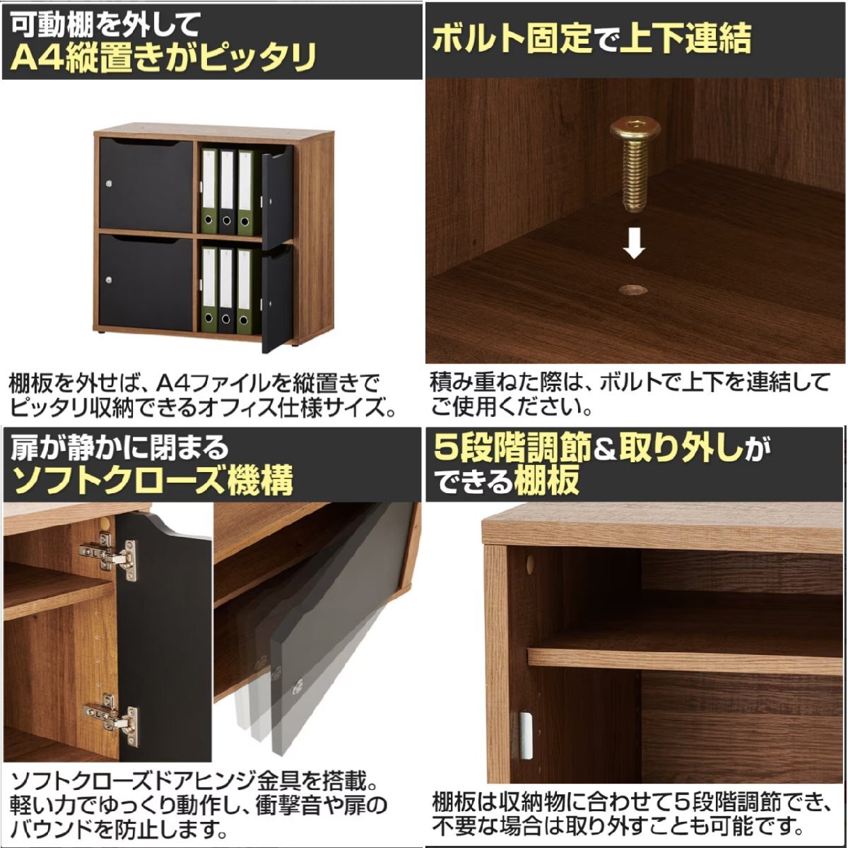 ■メーカー オフィスコム ■商品名・型番 レモダ パーソナルロッカー 4人用 2列2段 OC-CBML-WD02-4TU-NA ■サイズ 幅800×奥行397×高さ740mm ■重さ 28.4kg ■カラー ナチュラル ■必要工具 スパナ(付属)、プラスドライバー ■組み立て お客様組立の商品です。 ■その他 ・LEMODA(レモダ)シリーズのキャビネットと組み合わせ可能 ・棚板付き(32mmピッチ・5段階調節・取り外し可能)
