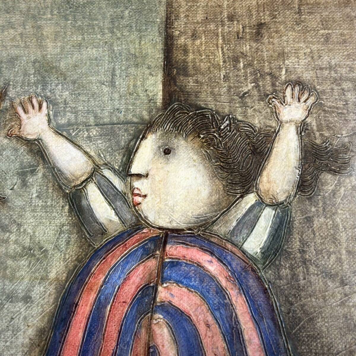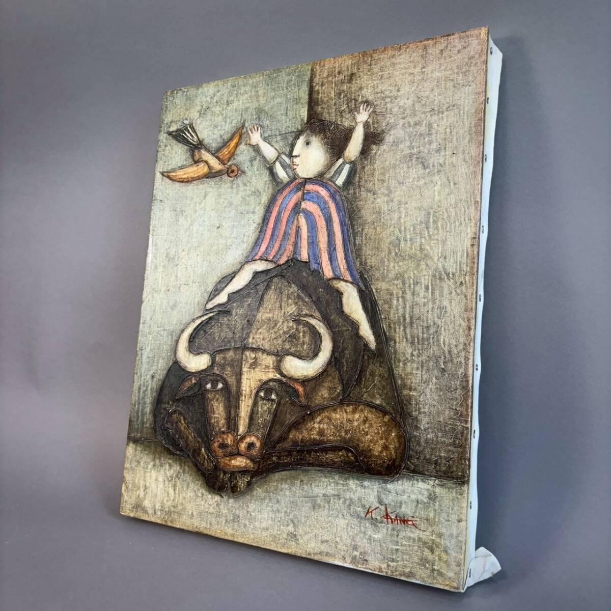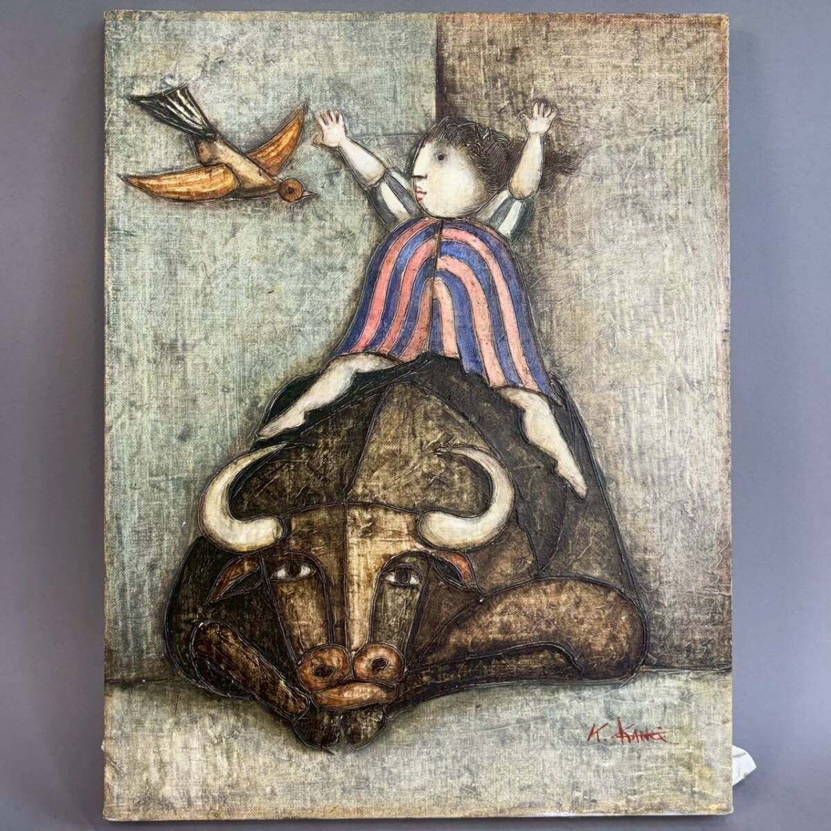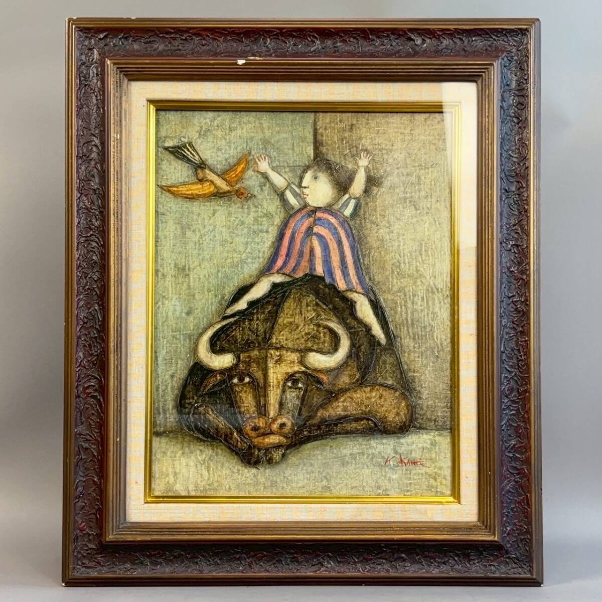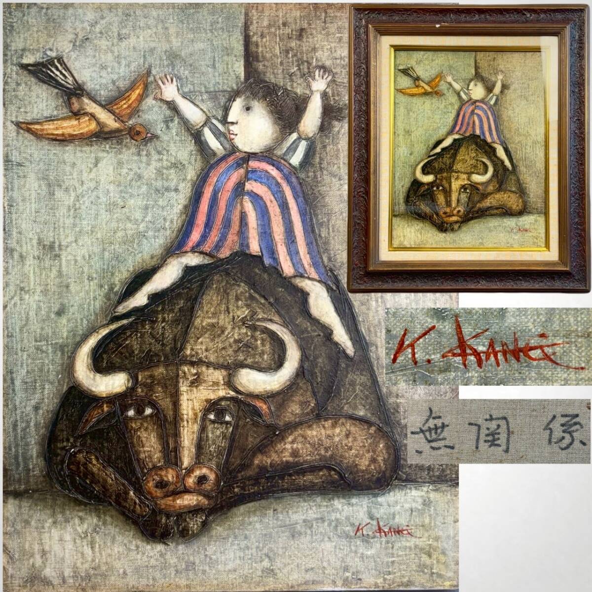YM1177 具本昶 (KU BON CHNG) 「無関係」 額装 真作 サイン入り 油彩 F6号サイズ 検)韓国美術 画家 人物画 牛 鳥 こども 絵画 詩情派