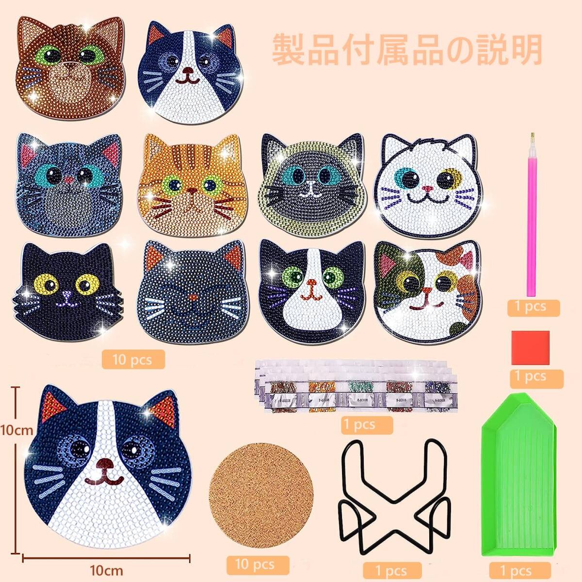 Vukayoダイヤモンドアート コースター キット 刺繍キット ビーズアート ダイアモンドアート セット DIYダイヤモンドペインティング 5Dダイヤモンド塗装キット ホルダー付き コースター 手芸キット 初心者、大人、子供用 人気 手作り アートクラフト用品 ZSHBD-02 (10pcs, 猫)