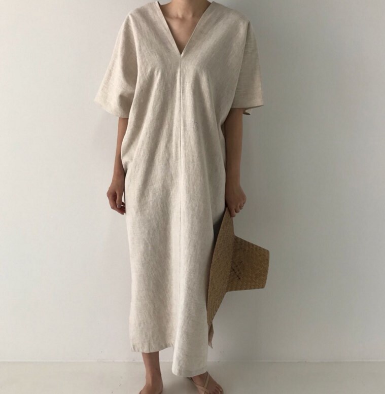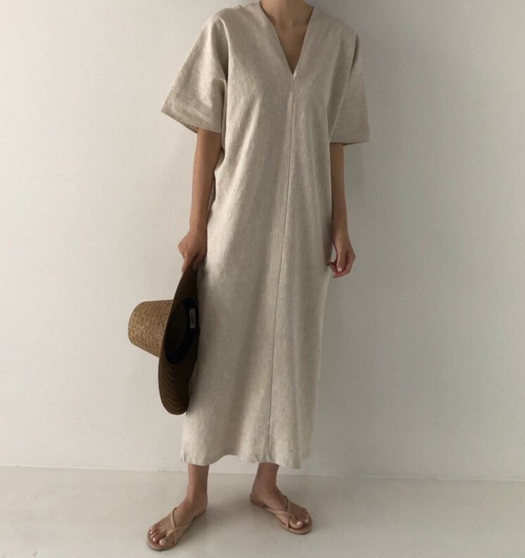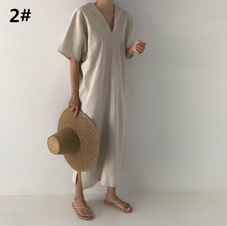 INS大人気 ワンピース レディース 麻 麻混 リネン Vネックワンピース 半袖ワンピース スリット ベージュ QZ627Z