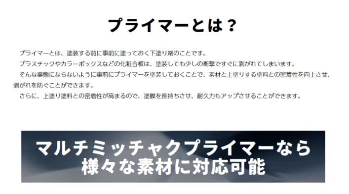 ・淡緑色透明 0.25 リットル 4976124402029・【特長】 幅広い用途に使用できる油性(弱溶剤)1液型プライマーです。 上塗りの適正は(ラッカー・油性・水性)です。 プラスチックなどの樹脂面から亜鉛メッキなどの金属面まで幅広い素材に対応します。 トルエンフリー・弱溶剤タイプでクロムなどの有害金属を使用していない環境配慮商品です。商品の説明・ 【特長】 幅広い用途に使用できる油性(弱溶剤)1液型プライマーです。 上塗りの適正は(ラッカー・油性・水性)です。 プラスチックなどの樹脂面から亜鉛メッキなどの金属面まで幅広い素材に対応します。 トルエンフリー・弱溶剤タイプでクロムなどの有害金属を使用していない環境配慮商品です。 【用途】 プラスチック(PE、PP、ABS樹脂、PET)、FRP、ガラス、アクリル板、亜鉛メッキ・アルミ・ステンレス・ガルバリウム・クロームメッキ・人工木など塗料の密着の悪い金属などの幅広い素材。 ※素材の状況などによっては密着しない場合がありますので、必ず見えにくいところなどで試し塗りをしてください。 【塗り面積(1回塗り)】 約3m2(タタミ約1.8枚分) 【容量】 200ml 【うすめ方】 ※本品はうすめずに使用してください。 【乾燥時間】 約40分 ※上塗り塗料の塗装は、3時間以上あけて、7日間以内に行ってください。 ※塗装後7日以上経過すると効果が薄れるため、再度塗り直してください。 (天候や素材によって差があります) 【注意】 ※誤飲・誤食防止の為、ペットボトル等の容器に詰め替えての保管は絶対にしないでください。・