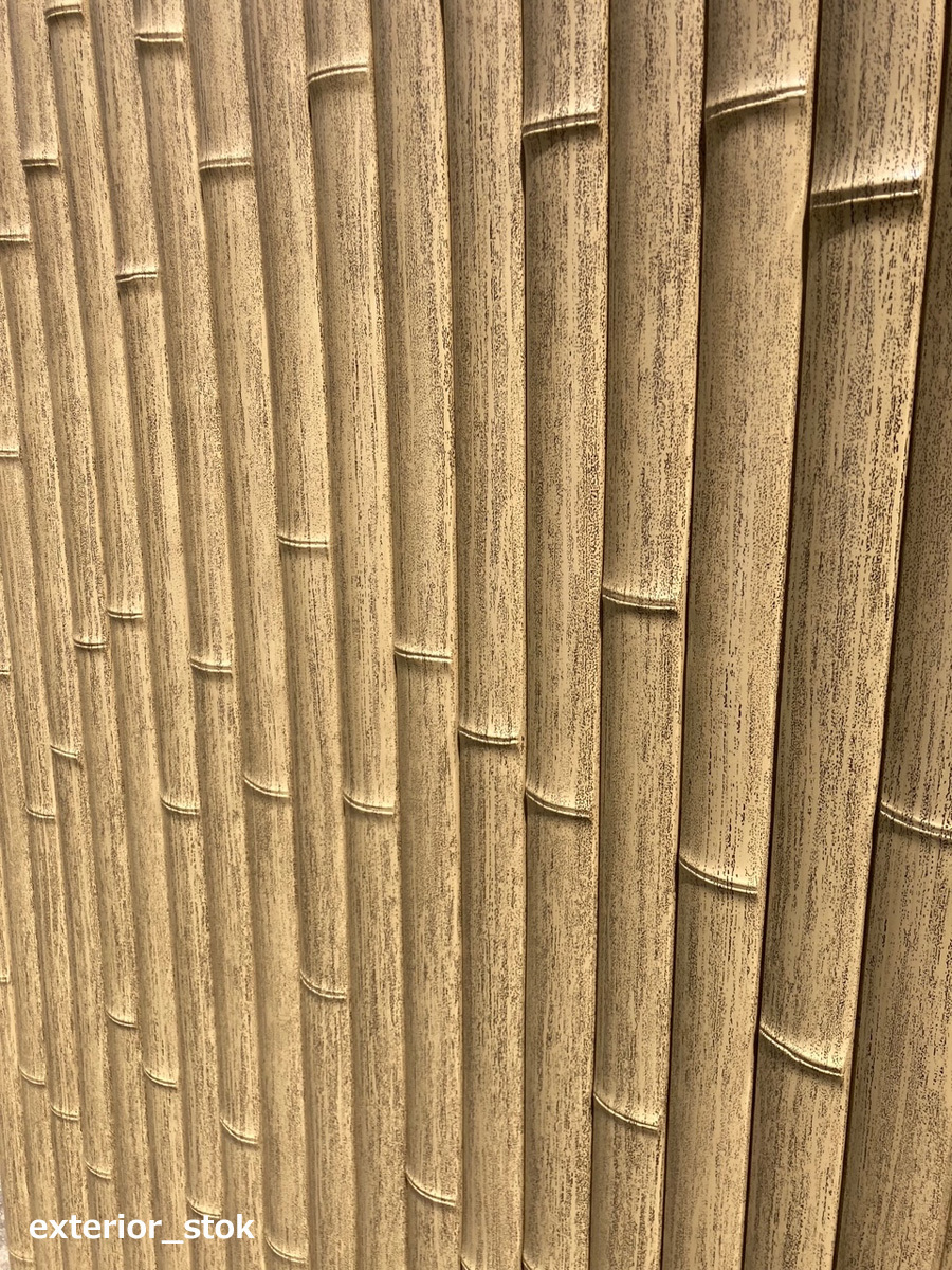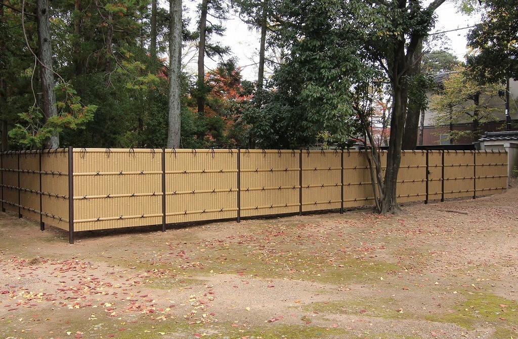 | 施工方法 | 2枚を連結する場合、パネルには向きがある為、重ね代を右側にして 左端から貼り付けを行います。 最後、余分な重ね代は、カッターナイフ等で切り落としてください。 ドリルビスは凹部分に打ち込んで下さい。 ドリルビスの本数は、幅900mmに対して横一列に5か所×胴縁の段数が目安です。 竹パネルと同じ頭がイエロー色の人工竹垣用ドリルビスのご提供も可能です。 お気軽にお問い合わせください。 |