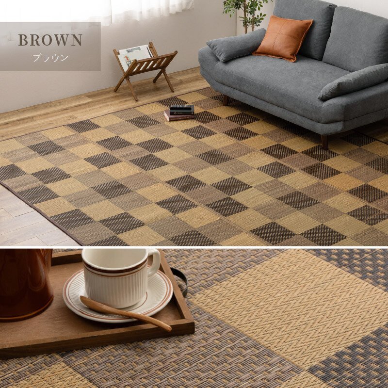 即決可@新品い草カーペット 柄上敷き 花ござ 裏貼り 市松柄 「うしお」ブラウン/江戸間3畳 | ||||||||||||