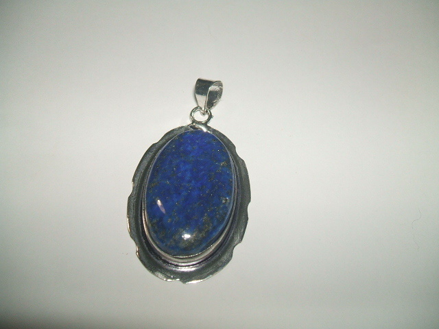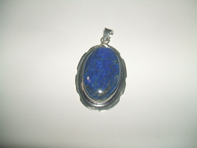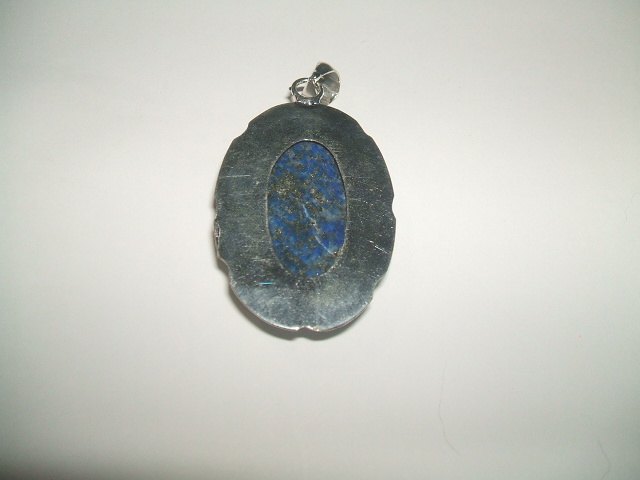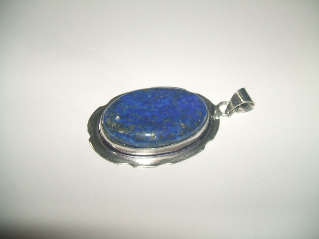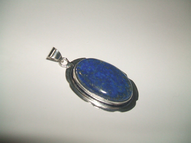 台座プレートにのったスマートなデザインのラピスラズリトップです。石の大きさは3.2x1.9センチ。プレート全体の大きさは約4x2.7センチ。金属はシルバーで925の刻印があります。