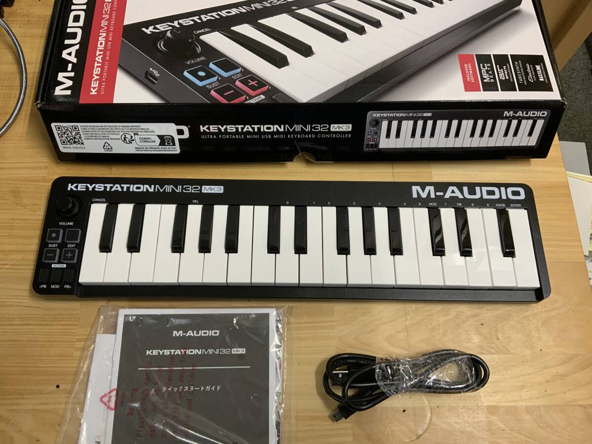 M-Audio USB MIDIキーボード 32鍵 Keystation Mini 32 MK3です。昨年11月、新品購入したものの、動作確認はしましたが、その後全く使わずほったらかしにしていたので、今回出品することにしました。同梱物等全てあります。薄くて、軽くて出先に持っていくのに全く苦にならないサイズです。興味のある方、どうぞよろしくお願いします。