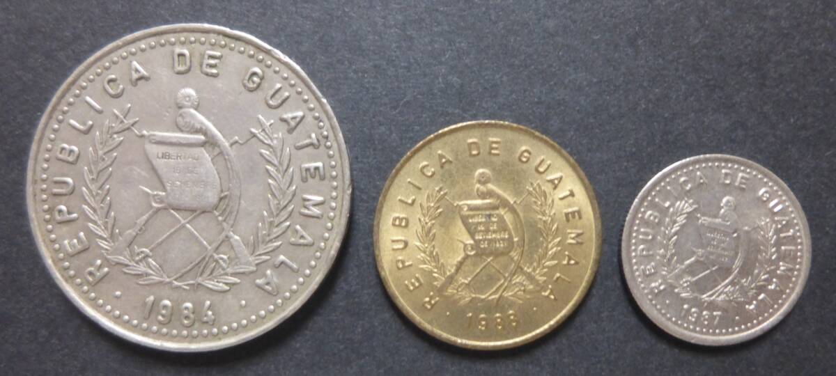 ガテマラで使用されていた、 25,5,1センターボ 硬貨 3枚です。
