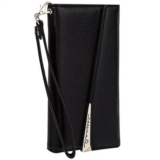 斜めにカットされた3つ折り仕様のケースにはメタリック素材のロゴエンブレムを配置。
