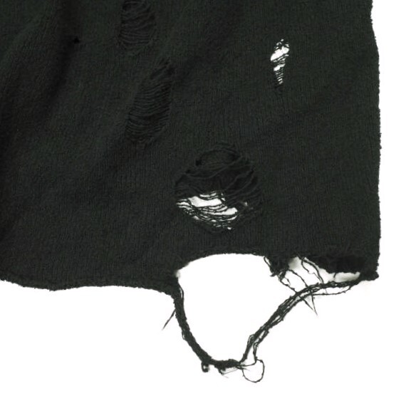 コットンブークレ糸を使用したハイゲージニットTシャツ。 全体的に起こした針抜きでハードなダメージを表現したデザイン。