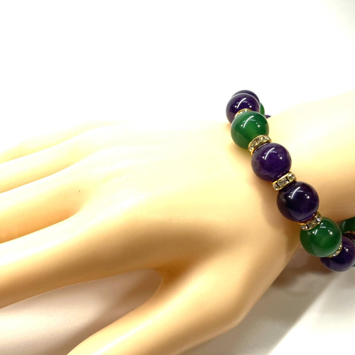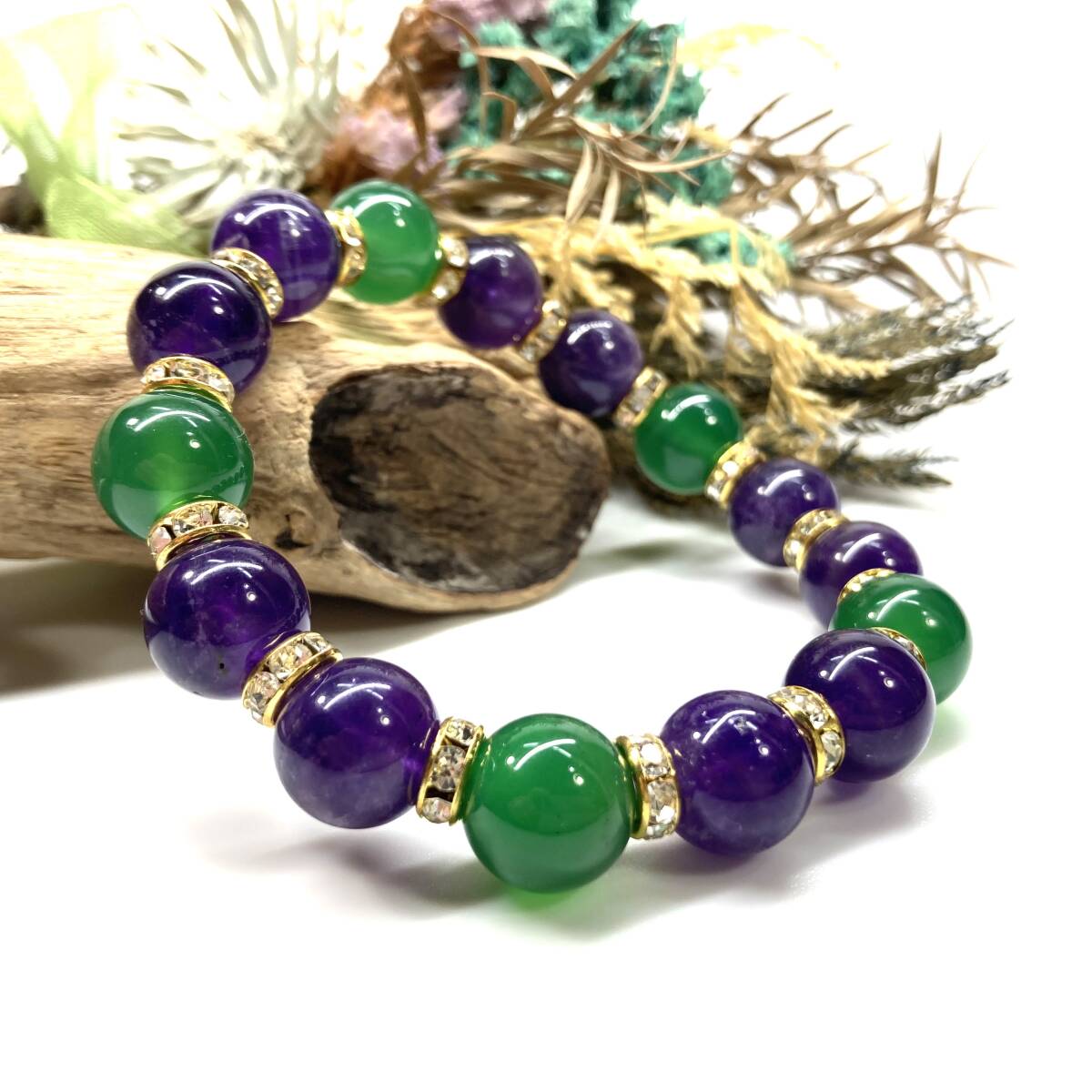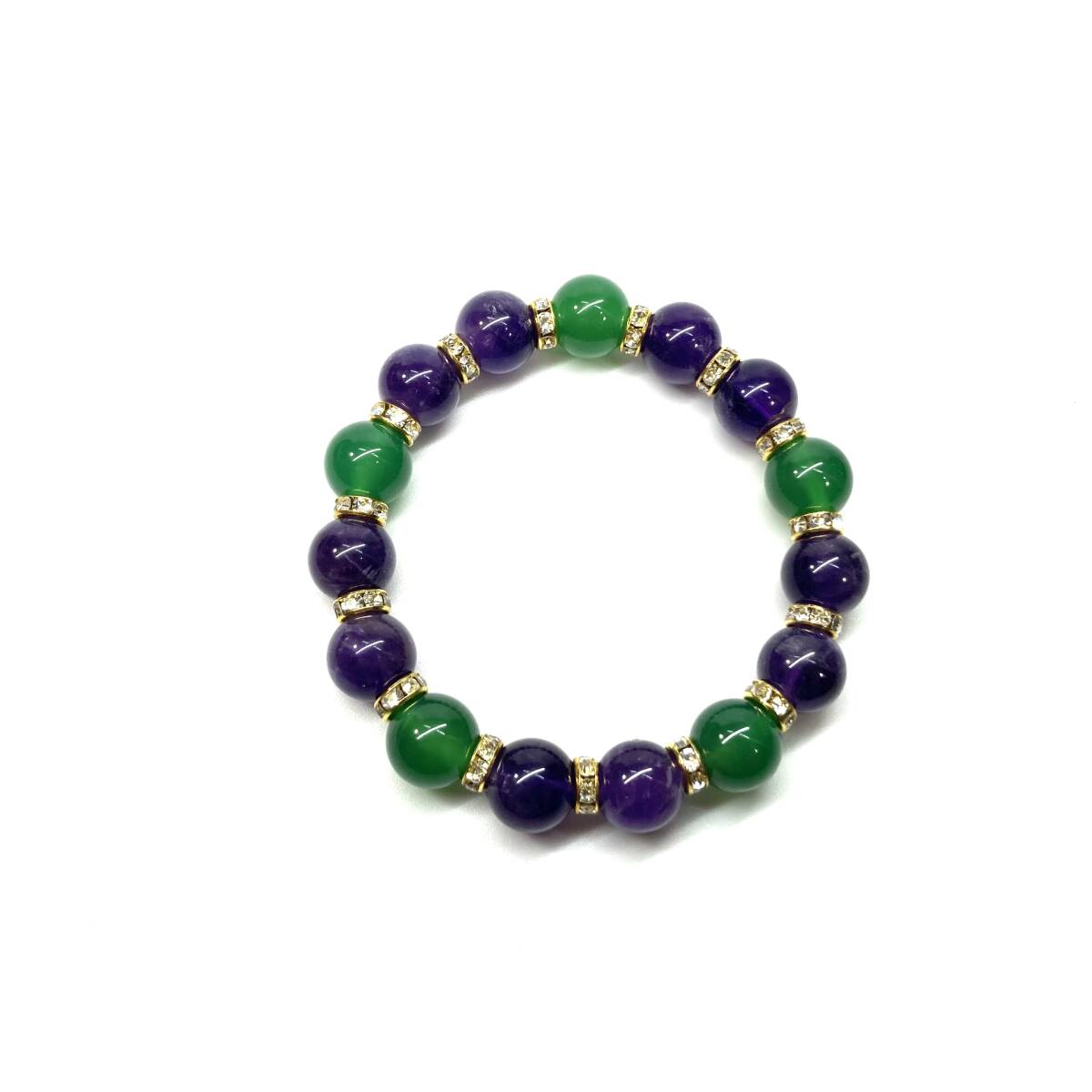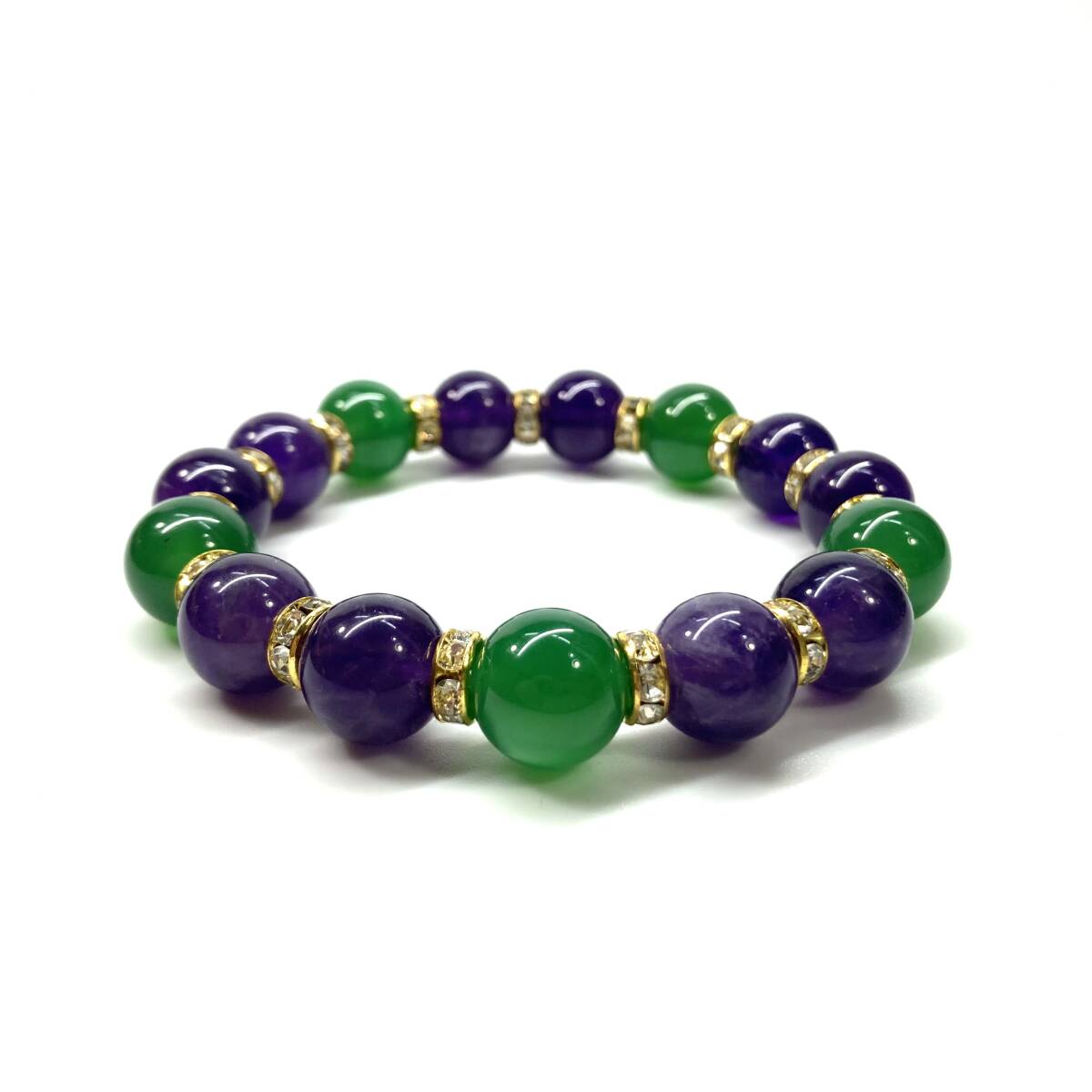 こちらは、緑瑪瑙とアメジストを組み合わせたパワーストーンブレスレットです。間にはロンデルを挟み高級感あるデザインに仕上げております。石大きさは12mm玉を使用して内周約18cmです。気になる方は是非この機会にどうぞ。