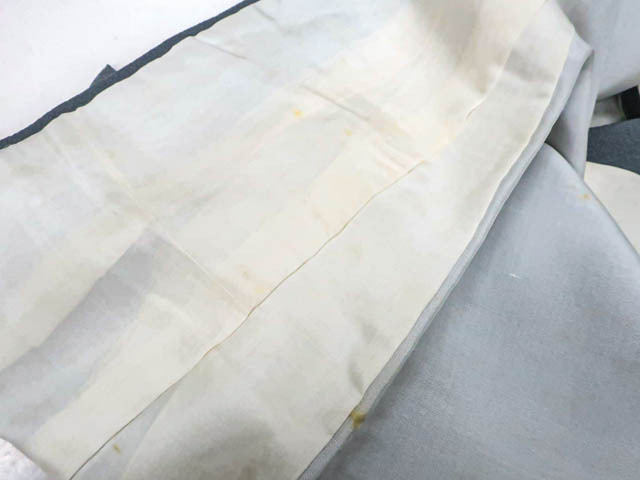 リサイクル商品のため、衿裏に薄しみがございますが着用可能なお品です。 地色は灰です。 1枚目の画像が近いお色かと思われます。 素材は正絹です。 |