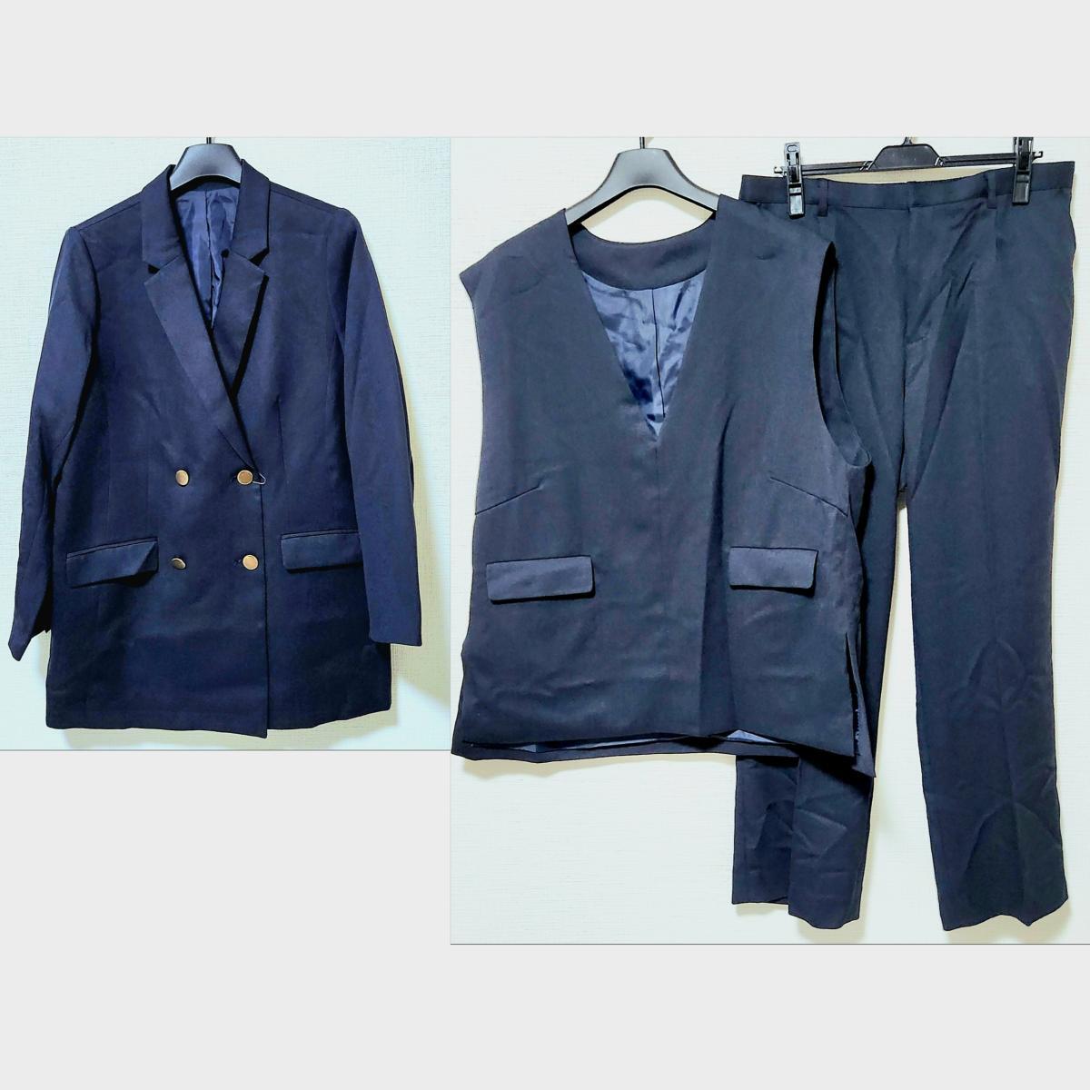 ドビー素材のダブルブレストジャケット、ベスト、テーパードパンツの3点セットです
