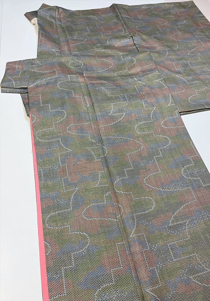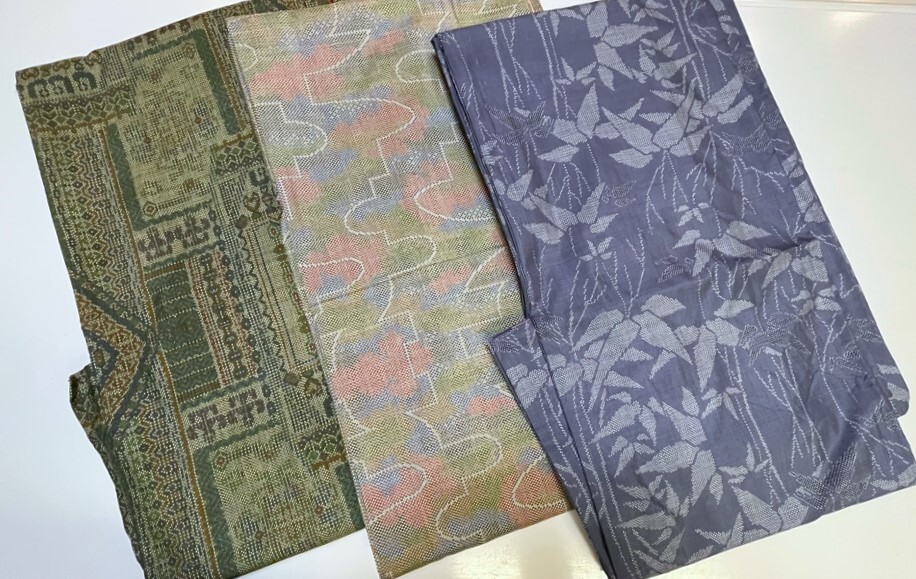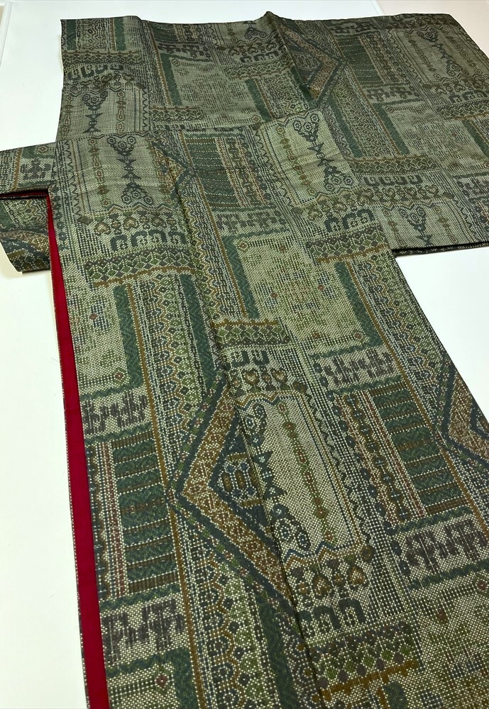 花とら●リサイクル着物 大島紬 3枚まとめて リメイク 素材 濃灰 幾何柄 緑系 欧風    250810