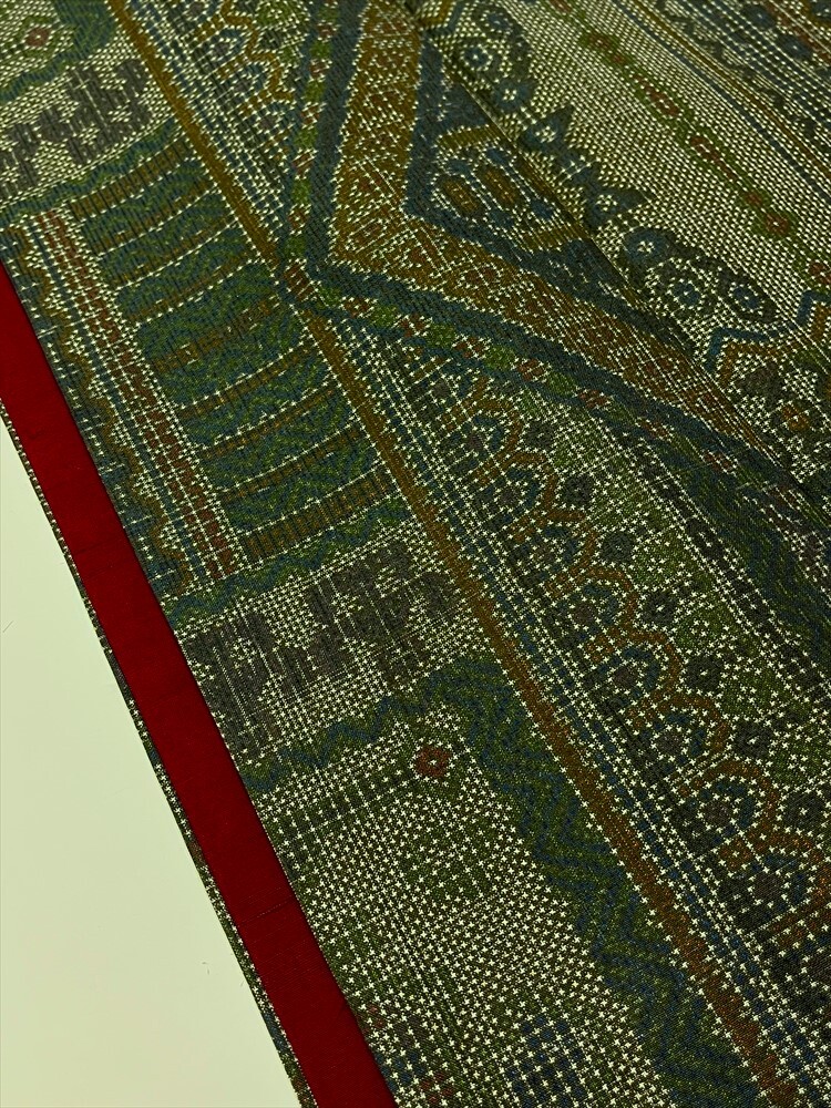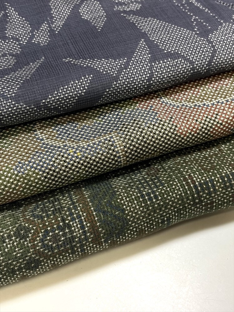 リサイクル着物 大島紬 3枚まとめて リメイク 素材 濃灰 幾何柄 緑系 欧風