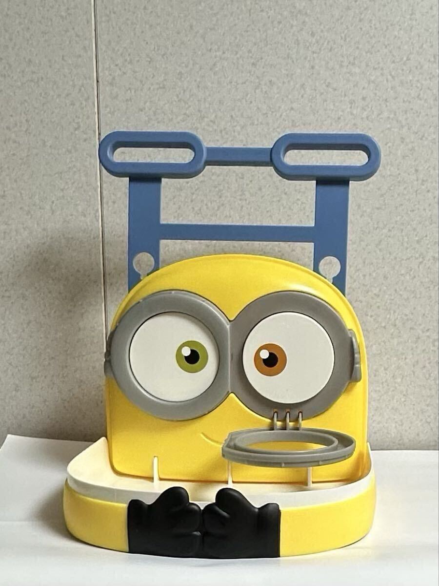 ボブの左目のグラス部分は下に開くとドリンクホルダーになり、トレイを閉じてコンパクトに持ち運び可能です。