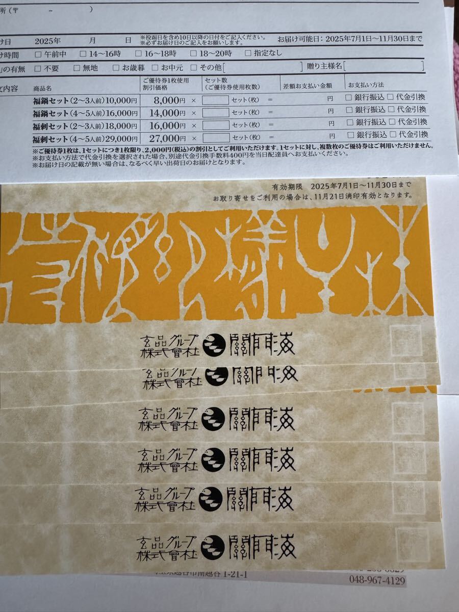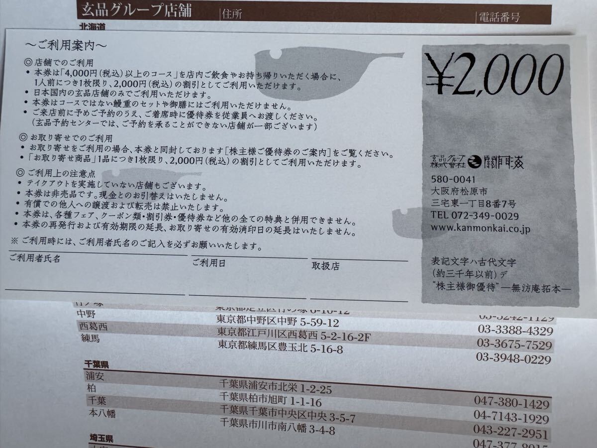 玄品グループで4,000円以上のコースで1枚2,000円割引が使える優待券です。