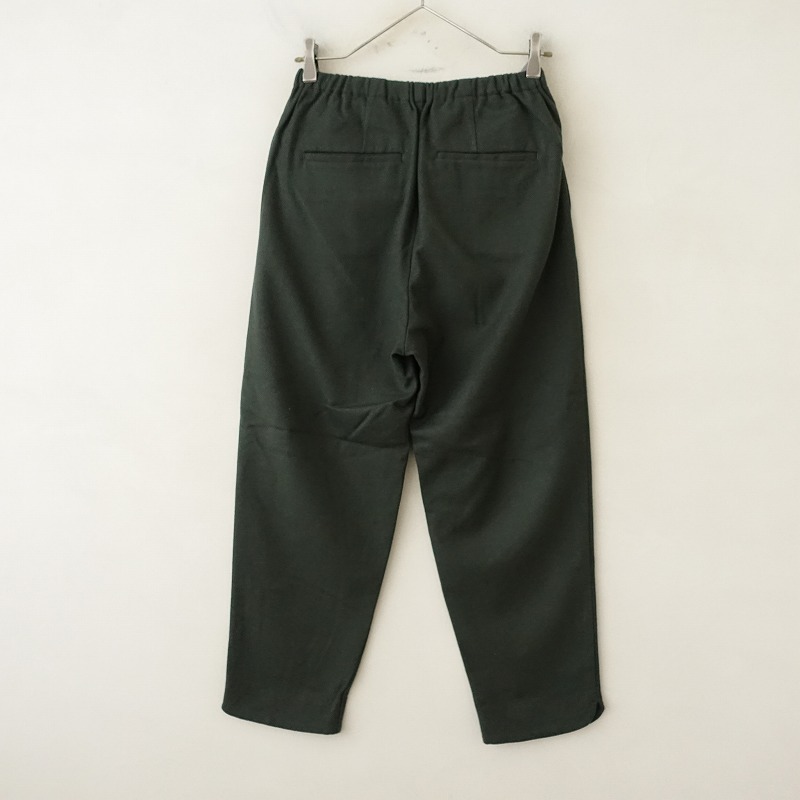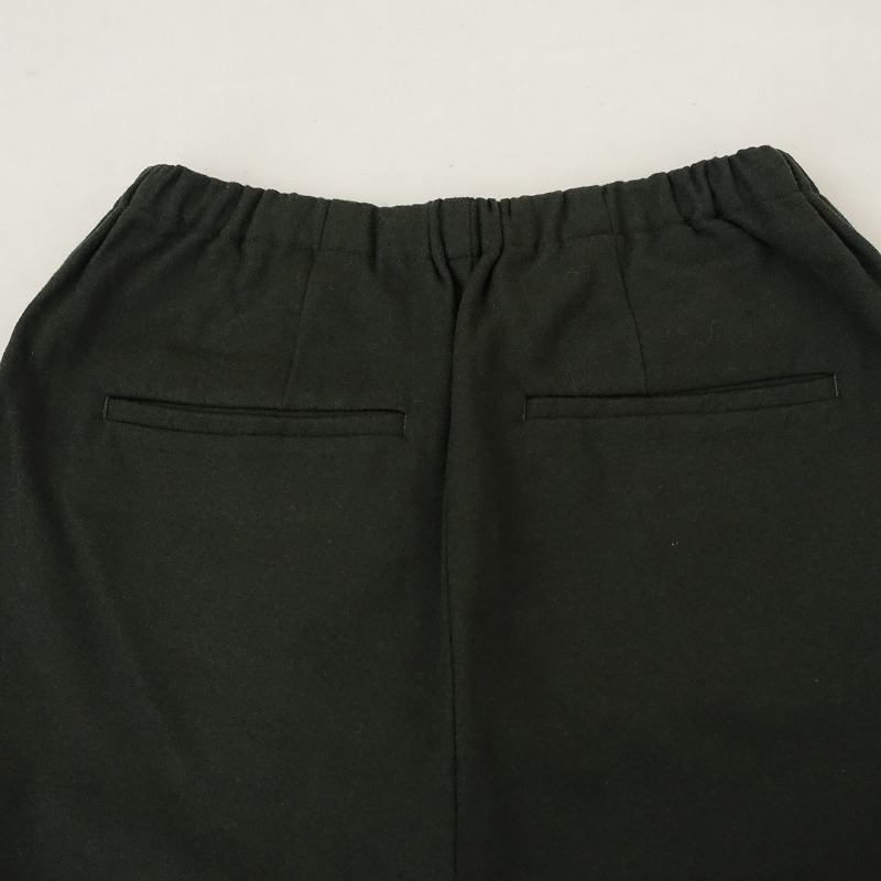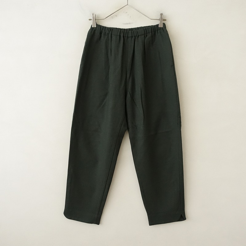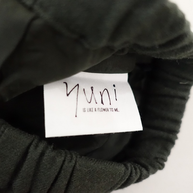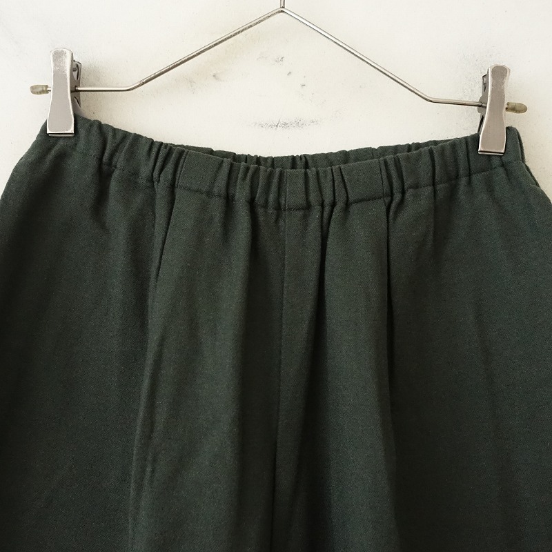 yuni IS LIKE A FLOWER TO ME.のウールカシミヤ混タックイージーパンツです。カラーはくすみのあるダークグリーンで、毛カシミヤなど混紡の微起毛素材です。前腰にタック入りで、裾サイドはラウンドカット仕様です。ウエスト総ゴム&紐入りで、腰両サイド&ヒップ左右にポケットがあり、裏地付きです。 |