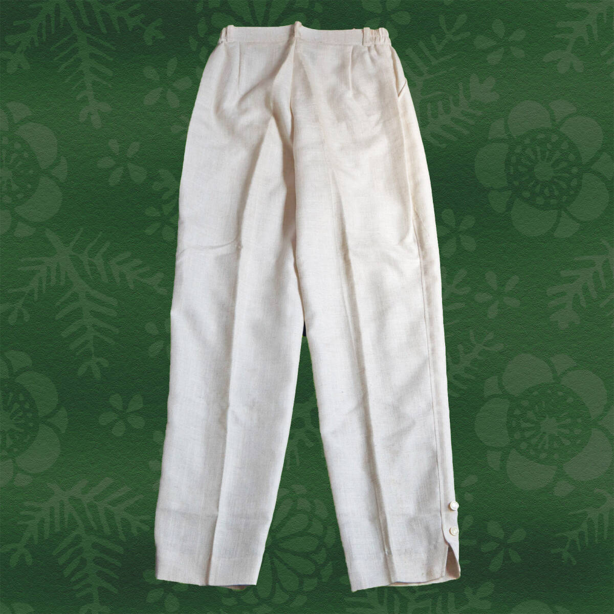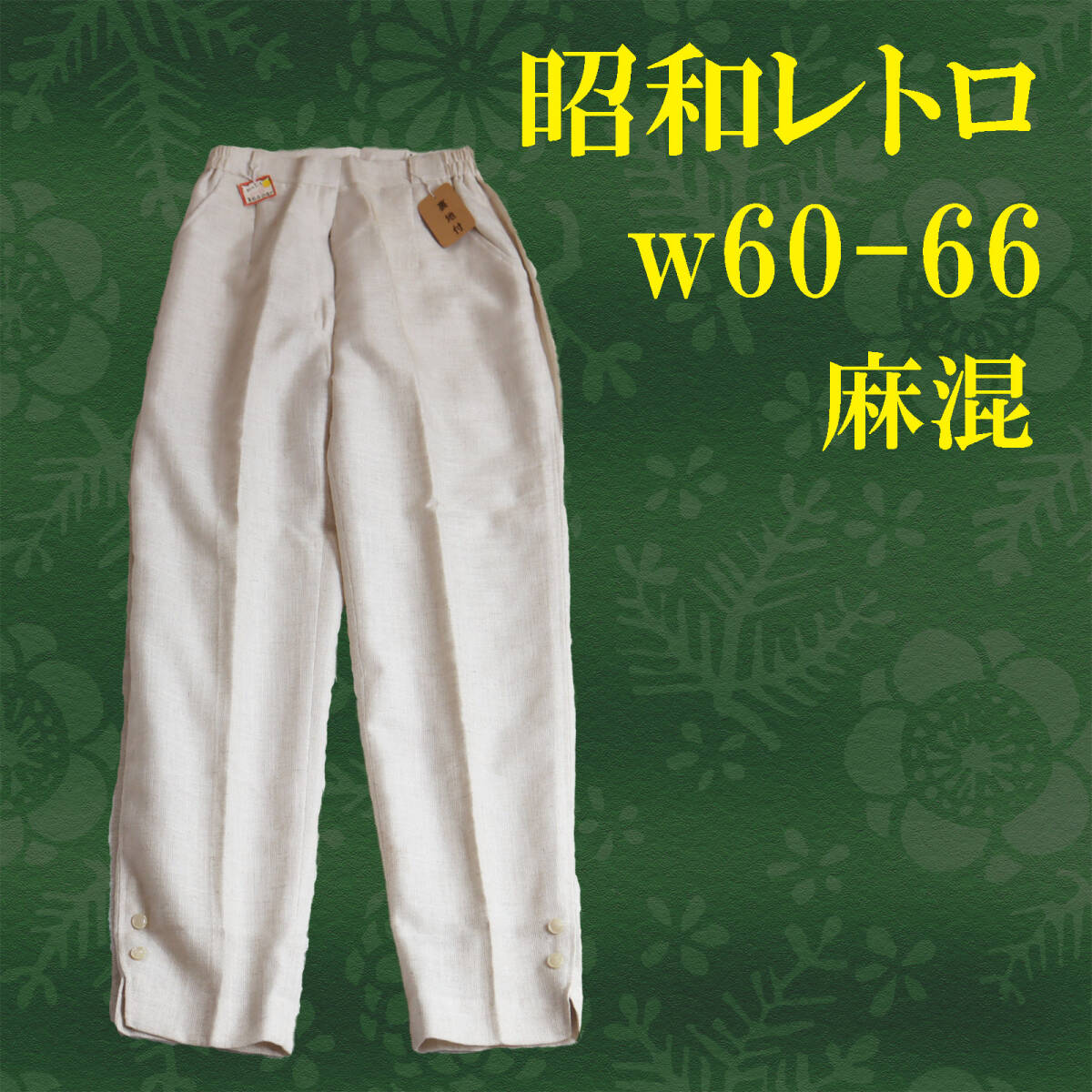 | 昭和レトロ テパードパンツ 麻混 裏地付き 裾にボタン 切り込みあり ウエスト脇ゴムあり ベルト通し ポケットあり ◆素材:ポリエステル70 麻30 ◆サイズ:ウエスト58(脇ゴムあり) ヒップ88 股上29 股下64 渡り幅28 裾幅16 ※長期保管品ですが、きれいな状態です。 ファスナーは問題なく上がります。 | |||