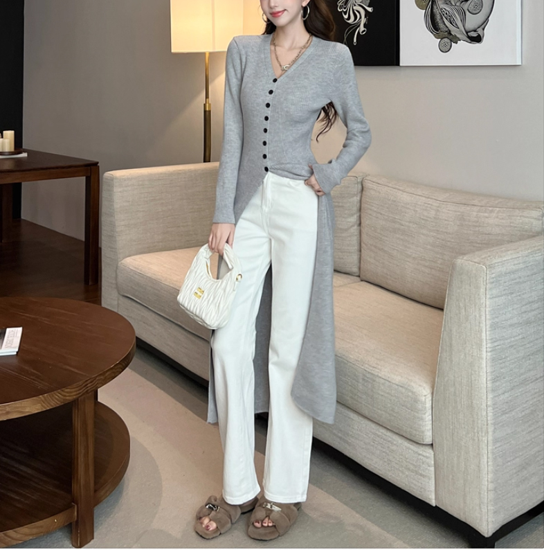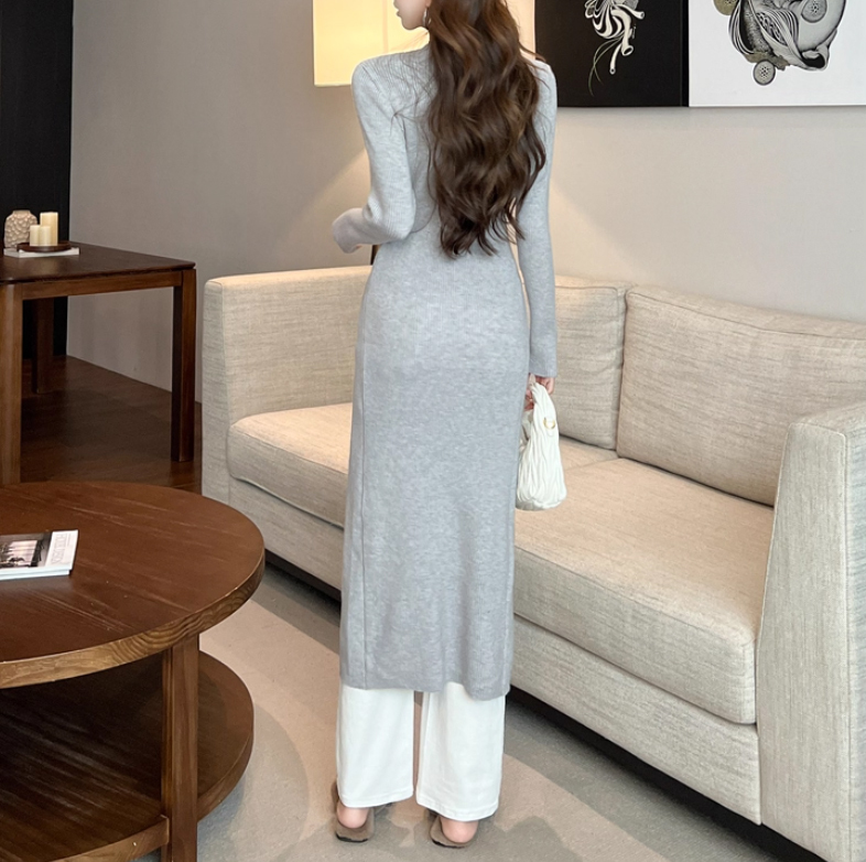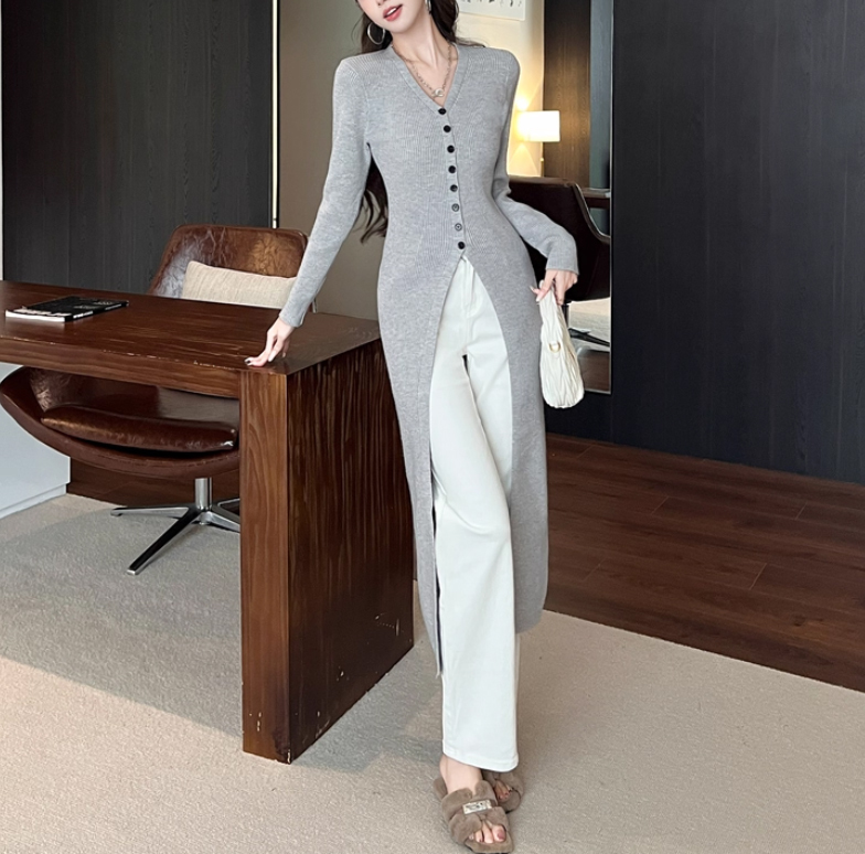 レディースロングカーディガンV字襟ニットワンピースライトグレーS