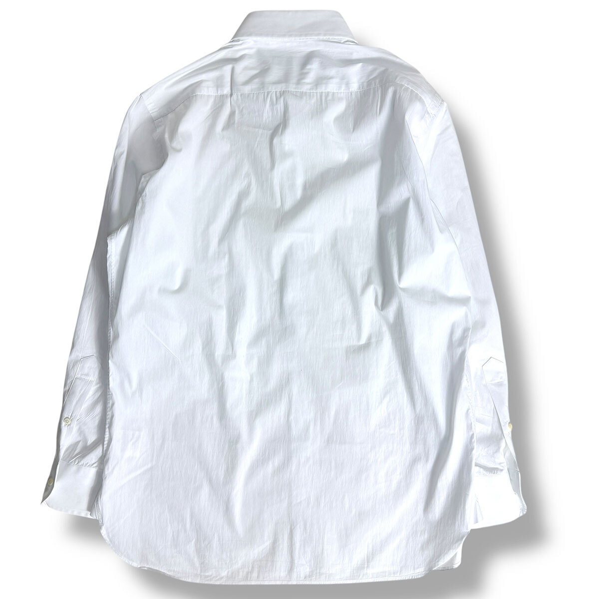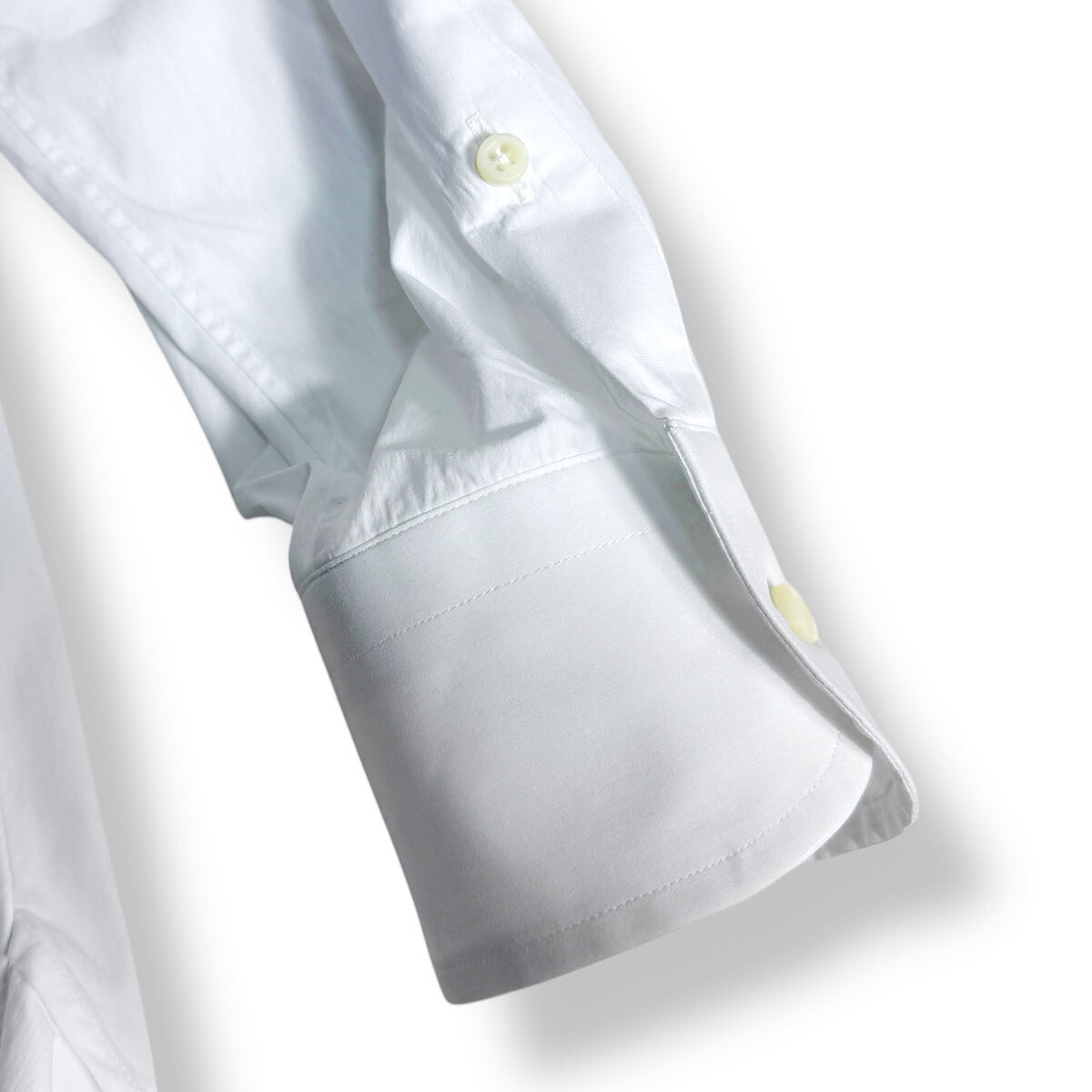 サイズ:41/16 ⇒肩幅45.5センチ、身幅58.5センチ、着丈77.5センチ、袖丈60センチ。 (すべて平置き採寸です。素人採寸のため誤差がある場合がございます。あくまで参考程度とお考えください。) 商品について:定価35,200円。マシンメイドの最高峰と称されるギローバーのドレスシャツです。繊細で美しいステッチワーク、カマ浅の立体的な袖付け、裾脇のガゼット補強など細部まで丁寧に作り込まれているのですごく満足度が高いです。ドレスシャツの中でも一二を争う人気を誇るセミワイドカラー「57」になります。どこのシャツブランドでも必ず用意しているセミワイドカラーですが、ギローバーの「57」は巷に溢れるセミワイドカラーとはひと味違います。約8センチの衿羽根を持つ端正な顔立ちのセミワイドカラーでありながら、上衿を台襟へ深く挟み込むことで控えめな襟のロールが生み出されており、ほんのりイタリアの色気を感じる仕上がりになっています。衿羽根の長さ、開く角度、襟のロール具合、芯材のやわらかさ、これらすべてが緻密に計算されたギローバーでしか作れない素晴らしい衿型です。襟腰と前台襟のバランスも絶妙で、ゆるやかに角度をつけることで首へのフィット感を極限まで高めています。左右の衿羽根に捻じれがなく、また、左右の衿先がまったく同じポイントに来ていることからも縫製技術の高さがうかがえます。襟そのものの完成度が非常に高いのでノーネクタイでも美しさが損なわれません。ビシッと決めたタイドアップスタイルにも、カジュアルなジャケパンスタイルにも、縦横無尽の活躍が期待できます。 状態:Sランク。未使用。 デザイン: ブランド名:ギローバー GUY ROVER AACD加盟リユースショップにて購入 アイテム名:シップス別注 C2570 コットンツイルセミワイドカラー ドレスシャツ 色:ホワイト 素材:画像参照。