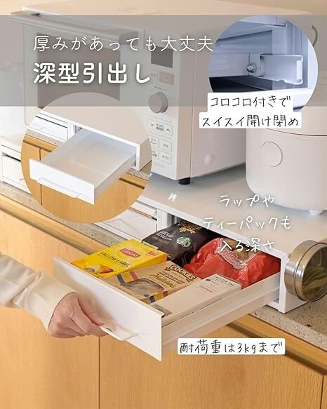 ●浅型引出しは、ラップやアルミホイルを(横置き)可能な深さ約4.5cm ※両端1.5cmの箇所の内寸深さは約3.5cm