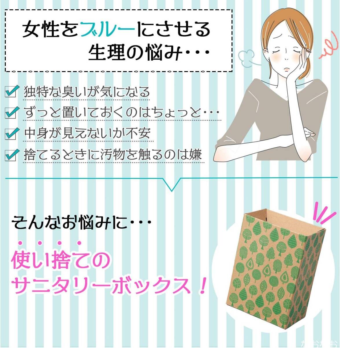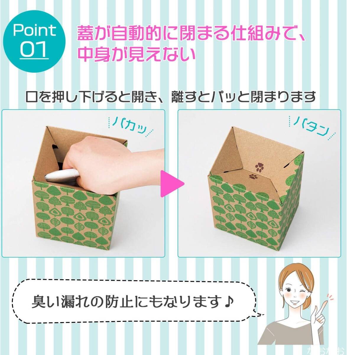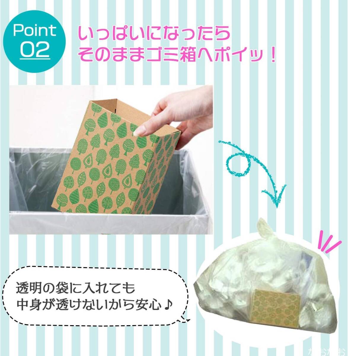使うときだけ置けて清潔。中が見えない紙製なので、いっぱいになったら箱ごとポイッとごみに捨てられます
