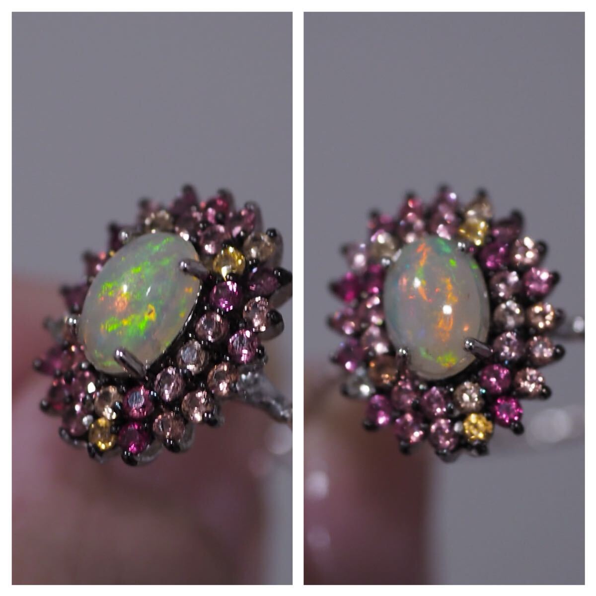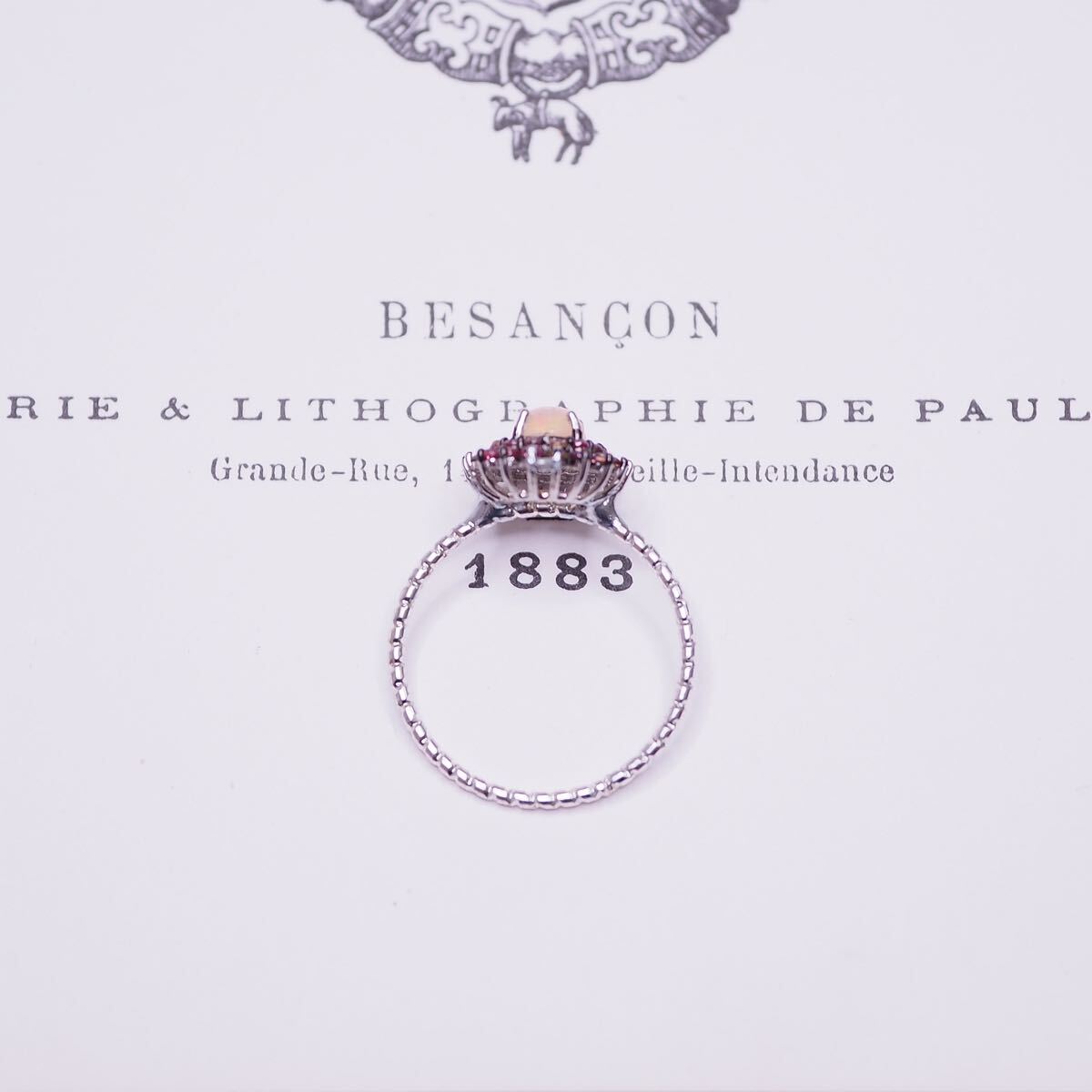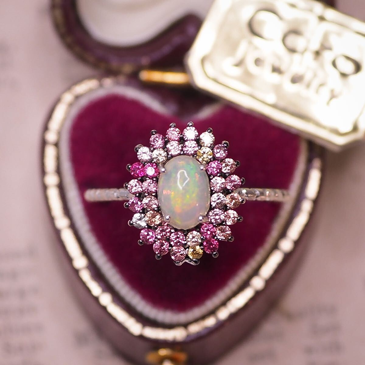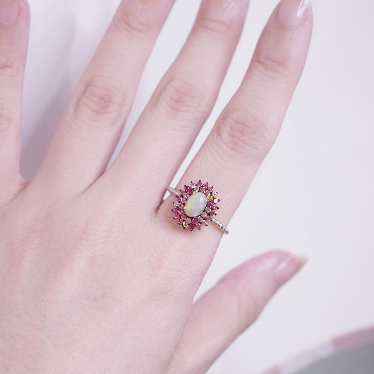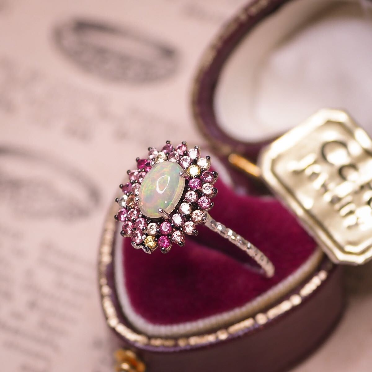 ぽわんとした雰囲気のみずみずしいウォーターオパール、七色の遊色がホログラムのようにハラハラと浮かび上がります。光源により見える表情は様々で、ぜひ色んな光源下で楽しんで頂きたいです。周りを取り巻くのピンクベースのマルチカラーのサファイア、キラキラと宝石箱をひっくり返したような取り巻きリングです。お写真ではビビットに写っておりますが、もう少し落ち着いたエレガントなお色味のジュエルです。
