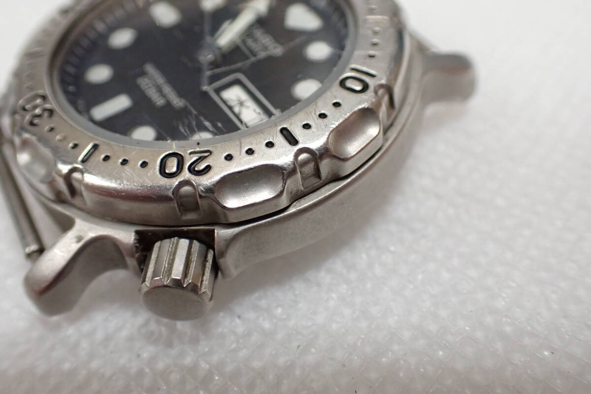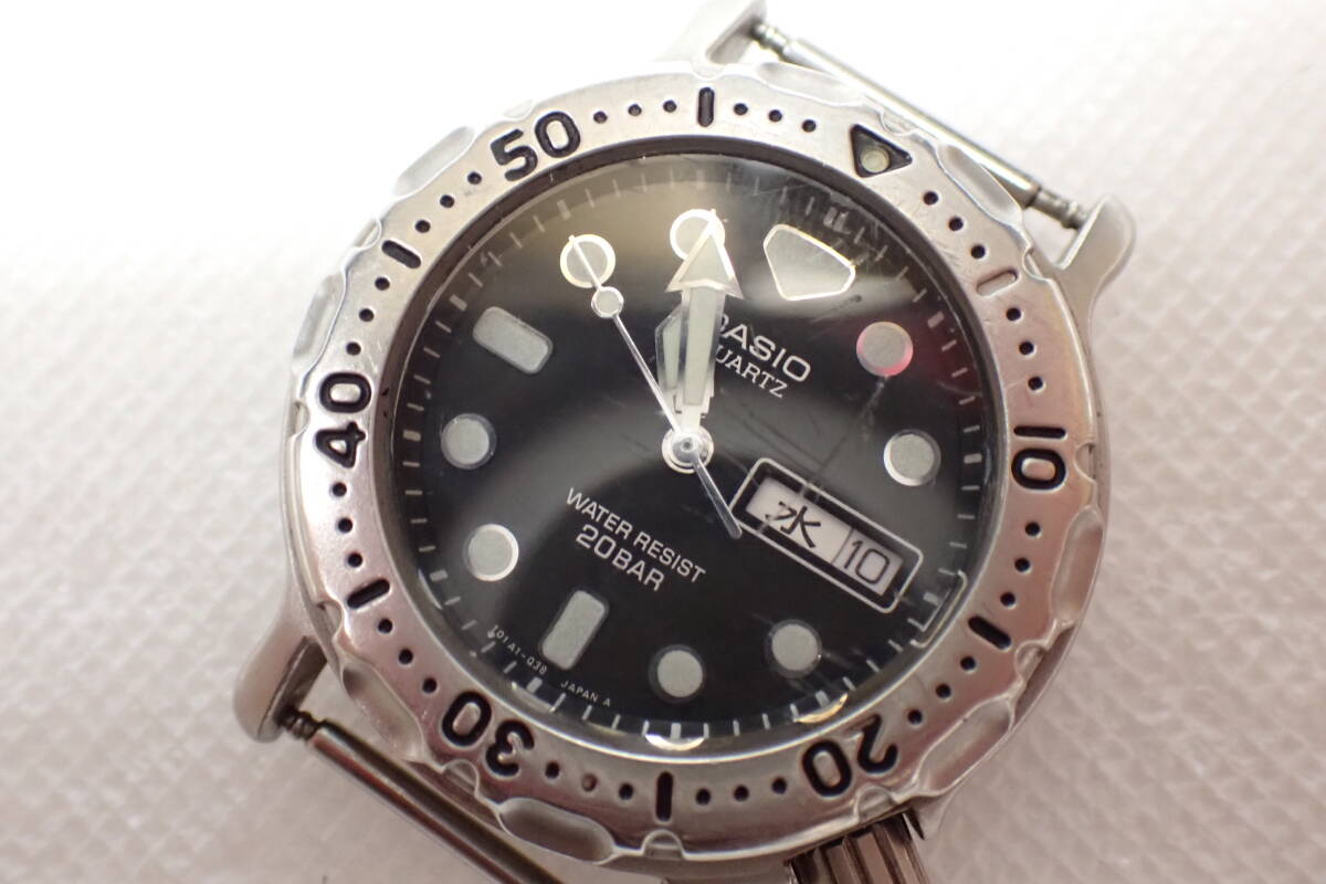 CASIO カシオ MD-704 メンズ ダイバーズウォッチ 腕時計 本体のみ 不動品 定形外郵便全国一律180円 D2-MA 中古品です。 風防にスレや小傷、ケースにスレやくすみなどの傷みがございます。 電池切れかと思われますが、稼働しておりません。 落札者様での電池交換が必要になりますが、交換後、動く保証はございませんのでご理解頂ける方のみ入札をお願い致します。 出品は、本体のみです。 ○サイズ ケース 約3.7cm×約3.8cm(リューズ含む) 重量 約50g ※素人採寸の為、多少の誤差はご了承ください。 詳しい状態などは画像を参考に判断してください。 状態の説明はあくまでも出品者の主観ですので、神経質な方のご入札はお控え願います。 写真に写っている物がすべてですので、その他に付属品などはありません。 ※ご使用のパソコン、モニターなどの環境によっては実際の色と若干異なって見える場合がございます。 お探しの方はお見逃しなく! この機会にぜひどうぞ! ノークレーム・ノーリターンとなります。 よろしくお願いします。 特定商取引法に基づく表記 【会社名】 株式会社 西川殖産 【代表取締役】 西川 守 【古物営業許可】 兵庫県公安委員会許可 第631641300006号 【店舗】 エタニティ野里店 【営業所所在地】 兵庫県姫路市野里311-3 アクロポリスⅡ-1F 【連絡先】 079-222-7705 【営業時間】 午前10時~午後7時 【定休日等】 水曜日は定休日となっておりますので、火曜日の夕方から水曜日にご入金、ご連絡などをしていただいた方へのご連絡・発送などは翌日以降となってしまいます。 オークションにつきましても、火曜日の夜から水曜日にご落札していただいた方へのご連絡は翌日以降となってしまいます。 ※その他、GW・お盆・年末年始などもお休みを頂いておりますので、その期間中などもご連絡・発送などできません。(※休みの期間はその都度異なりますので、お急ぎの方は事前にご質問などでご確認していただけますよう、よろしくお願いします。) こちらの都合で誠に申し訳ありませんが、あらかじめご了承いただいた方のご入札をお願い致します。 | |||
