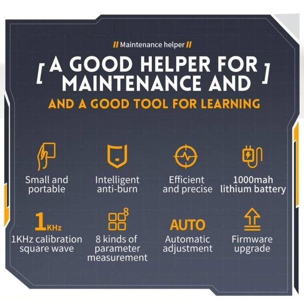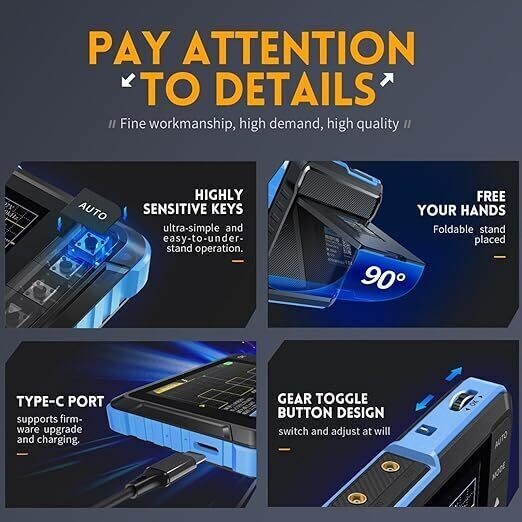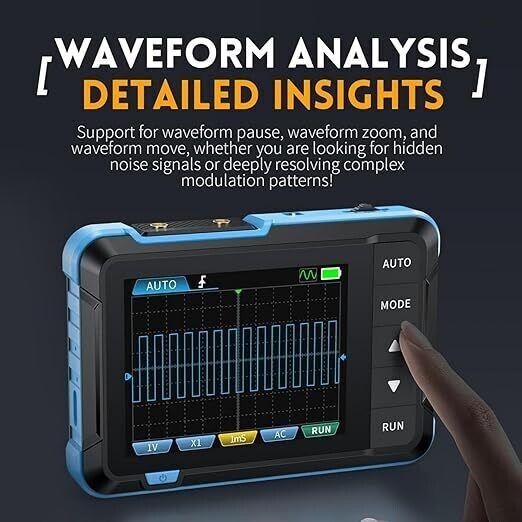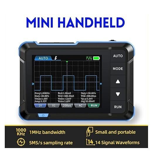 ポータブルデジタルオシロスコープ: 5.0MS/秒のリアルタイムサンプリングレートと1Mの帯域幅を備えたミニオシロスコープで、周期的なアナログ信号と非周期的なデジタル信号に適しています。プロフェッショナルなデザイン: フルトリガー機能 (オート、ノーマル、シングル) と解像度 320 x 240 の 2.8 インチ HD LCD スクリーンを備えています。 Type C インターフェースはデータ転送と充電をサポートします。ファームウェアの直接アップデートをサポートします。便利なミニオシロスコープ: 軽量で持ち運びが簡単な組み立て済みのマシンで、組み立て溶接の問題もなく使用できます。修理および研究開発産業に最適です。日々のテストのニーズを効率的に満たします。楽な測定:すべてのパラメータに対して効率的なワンキーAUTO設定を装備しており、面倒な調整をせずに測定波形を表示します。 AUTO ボタンを長押しすると、ベースライン校正と波形測定が迅速に行われ、ワークフローの効率が向上します。延長されたバッテリー寿命: 内蔵の 1000mAh リチウムバッテリーで、フル充電後約 4 時間の連続使用が可能です。 Type C充電ケーブルが付属しており、充電しながらの使用が便利です。