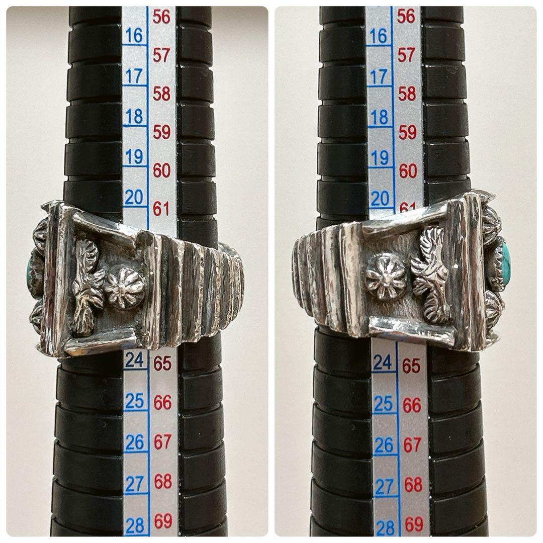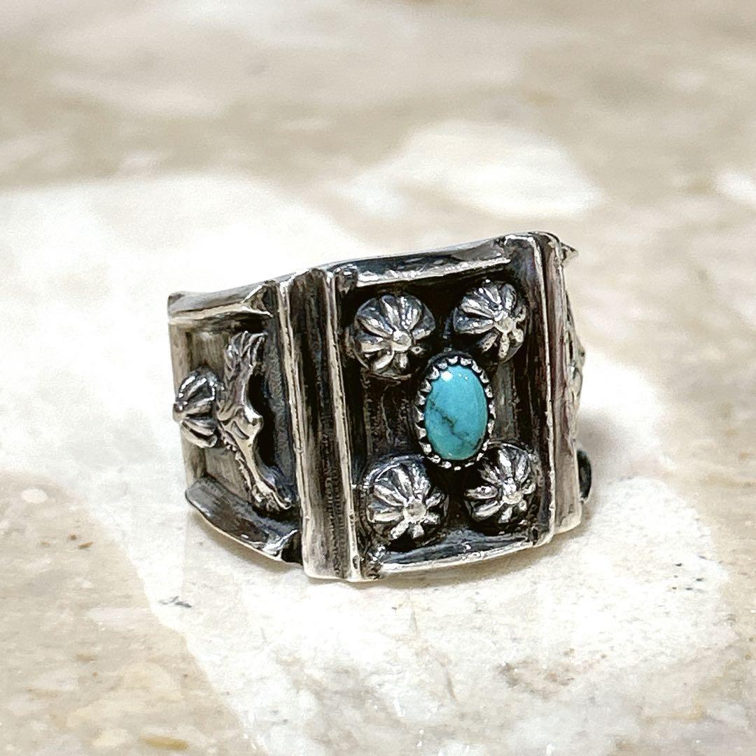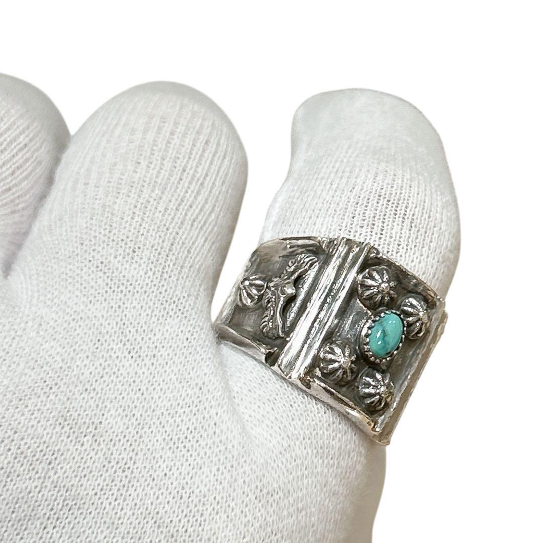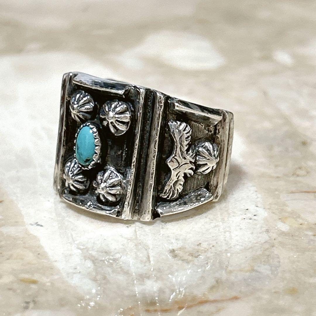 センターに天然ターコイズをセットし、周囲にはスタンプワークが施された力強いデザイン。サイドには羽を広げたイーグル(鷲)が立体的に表現され、存在感抜群の仕上がりです。