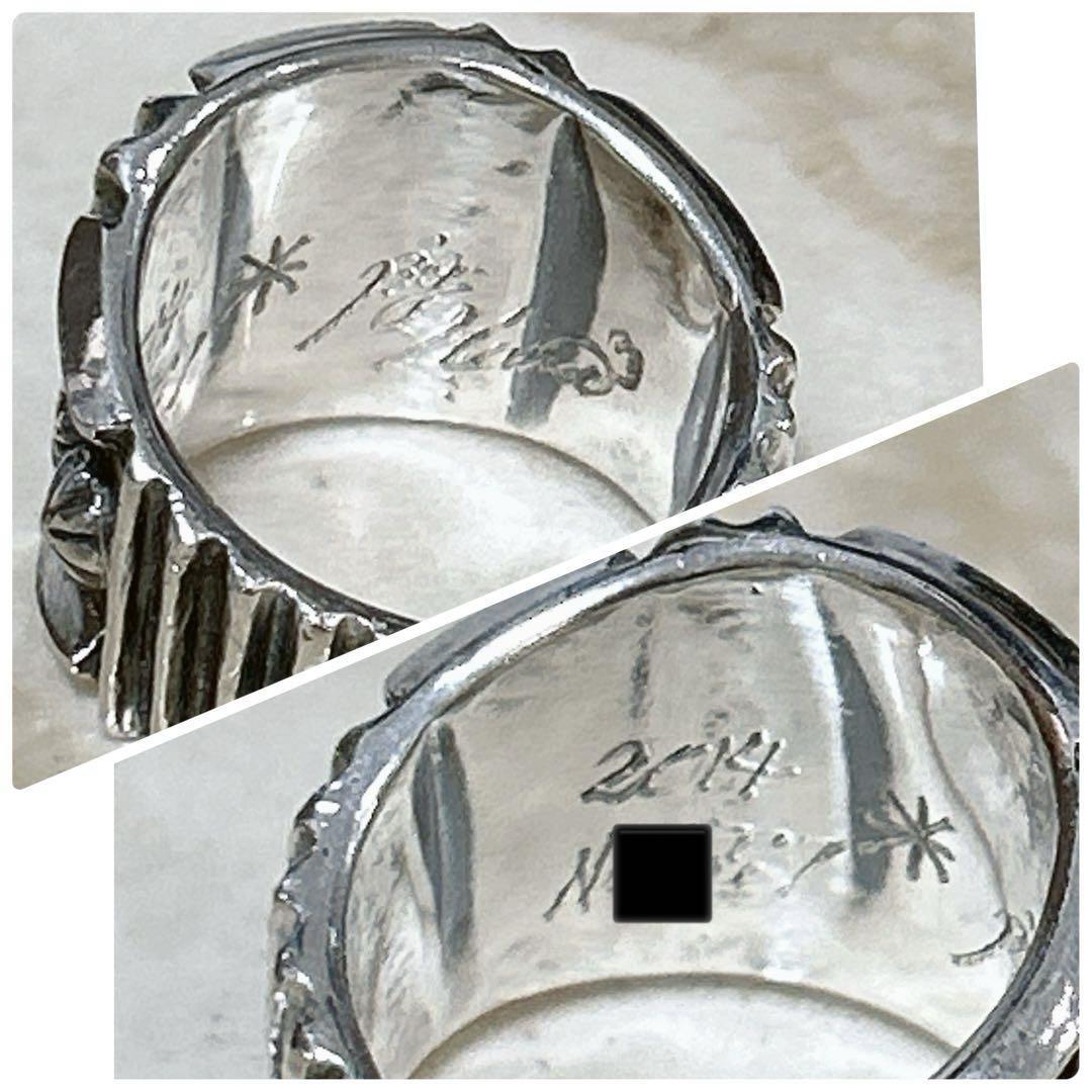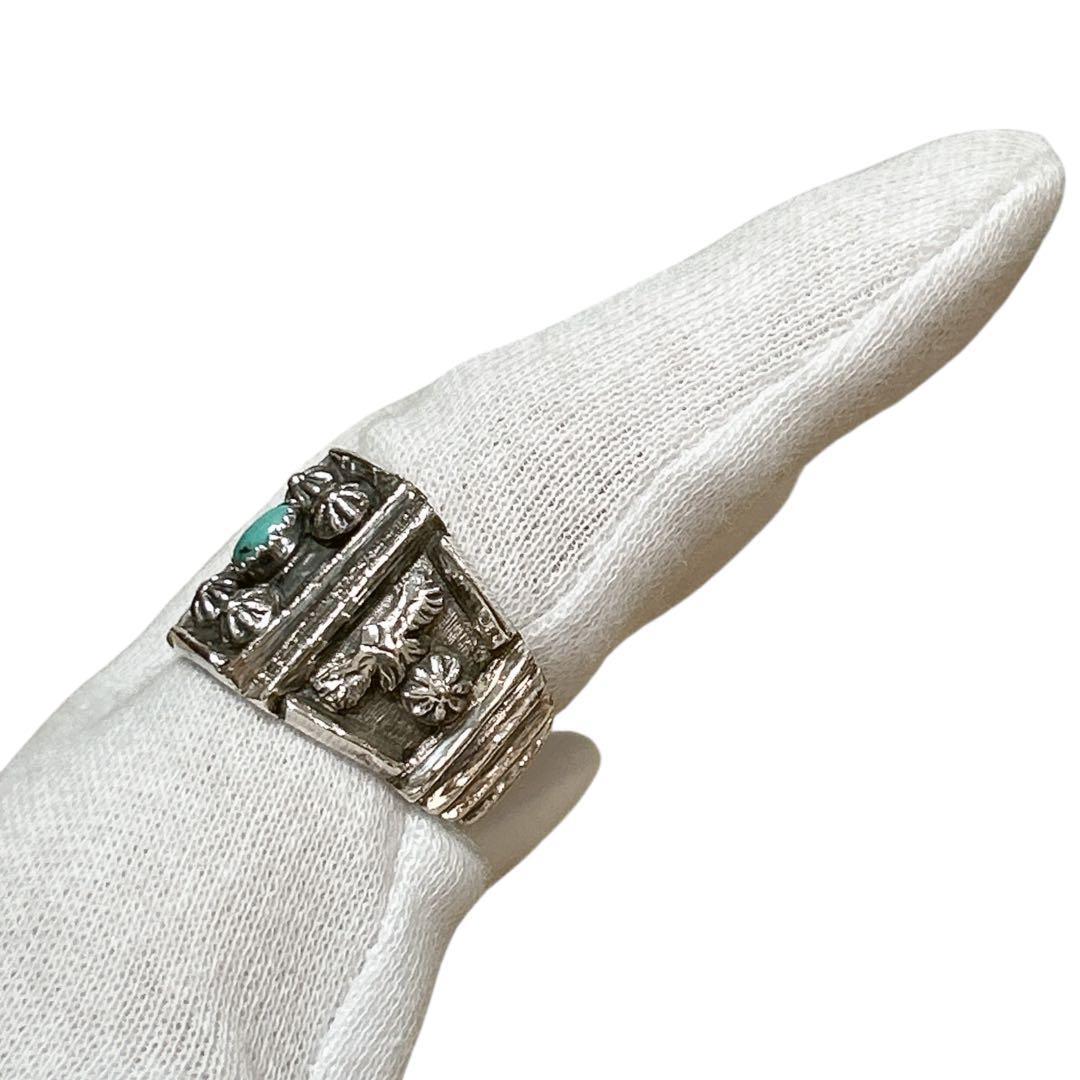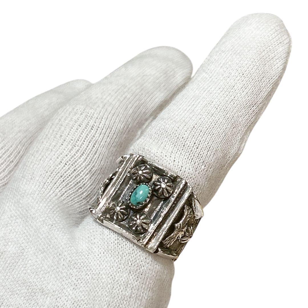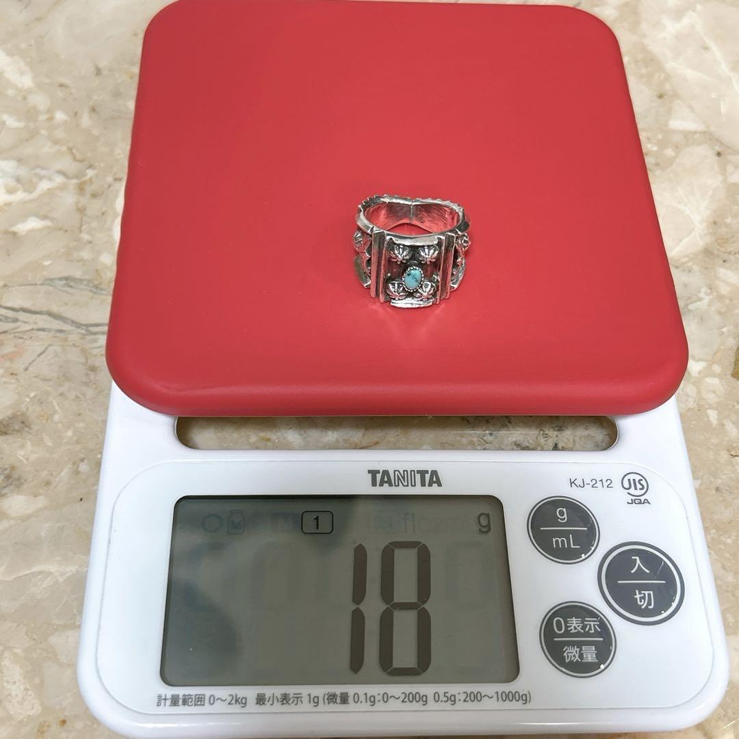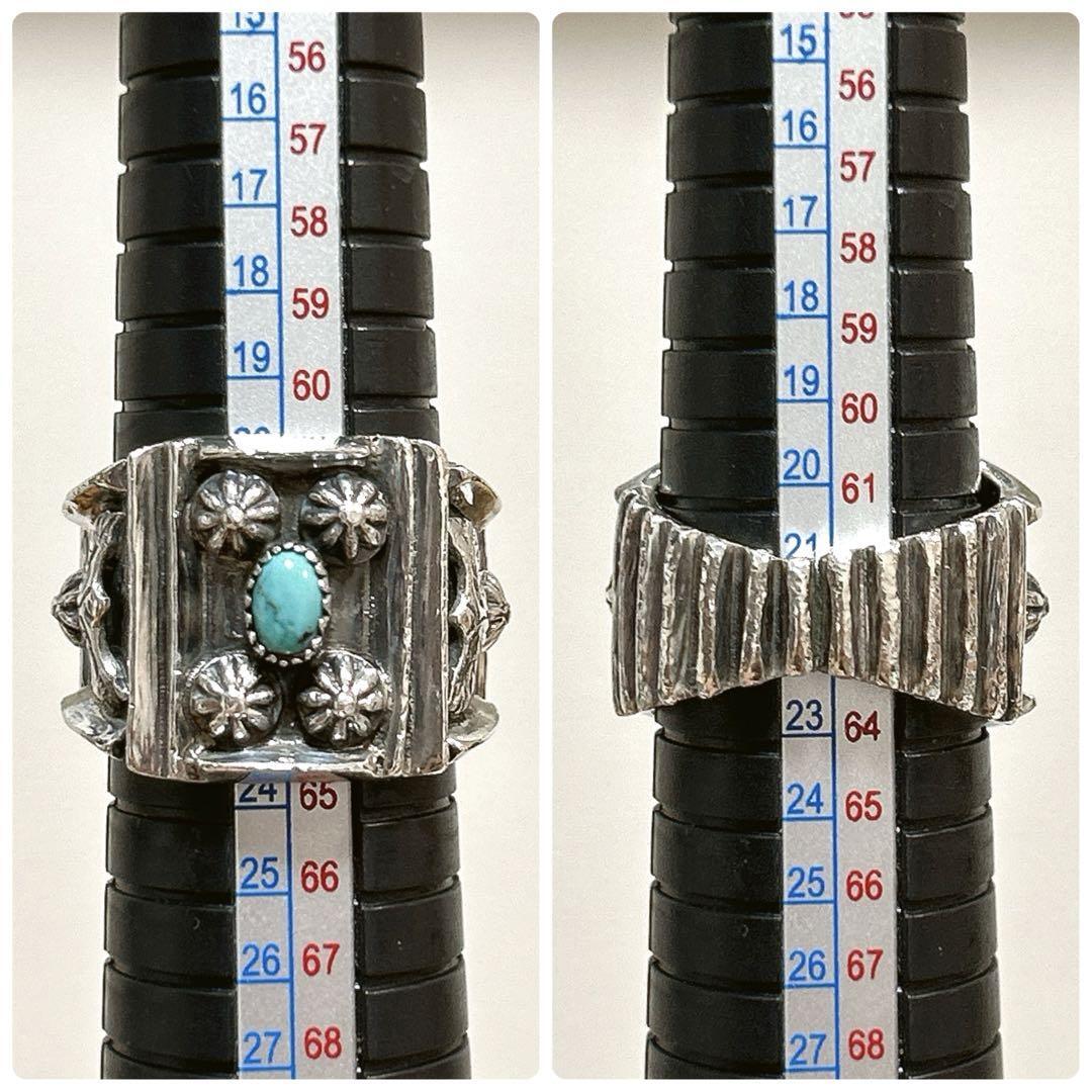 センターに天然ターコイズをセットし、周囲にはスタンプワークが施された力強いデザイン。サイドには羽を広げたイーグル(鷲)が立体的に表現され、存在感抜群の仕上がりです。