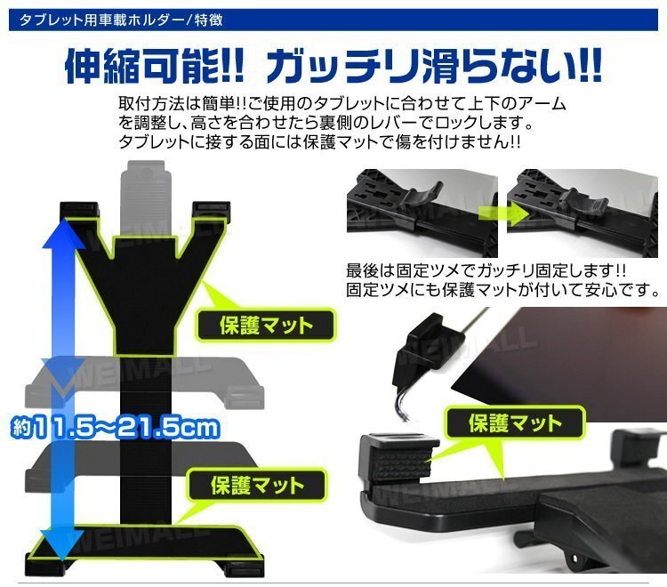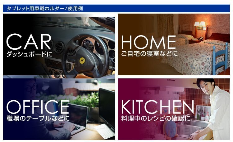 各社のタブレットを簡単に!ダッシュボードに取り付けできる! ホルダーのサイズを調節することで、様々なタブレットを取り付けることができます。 また、ケースを付けたままでも使用できます。 取り付け位置はカーナビと同じようにダッシュボード中央に配置できるので、車のどの席からも画面が見やすく、操作もしやすいです! アーム部が180度回転するので、前後どちらのスタイルでもお使いいただくことが可能で、タブレットを見やすい高さ・位置に調節できます! 水洗いして繰り返し使える真空吸盤採用! 車内だけでなく、いろいろな場所で使用可能です。 卓上でスタンドとして使用したり、冷蔵庫に取り付けたりもできます。 |