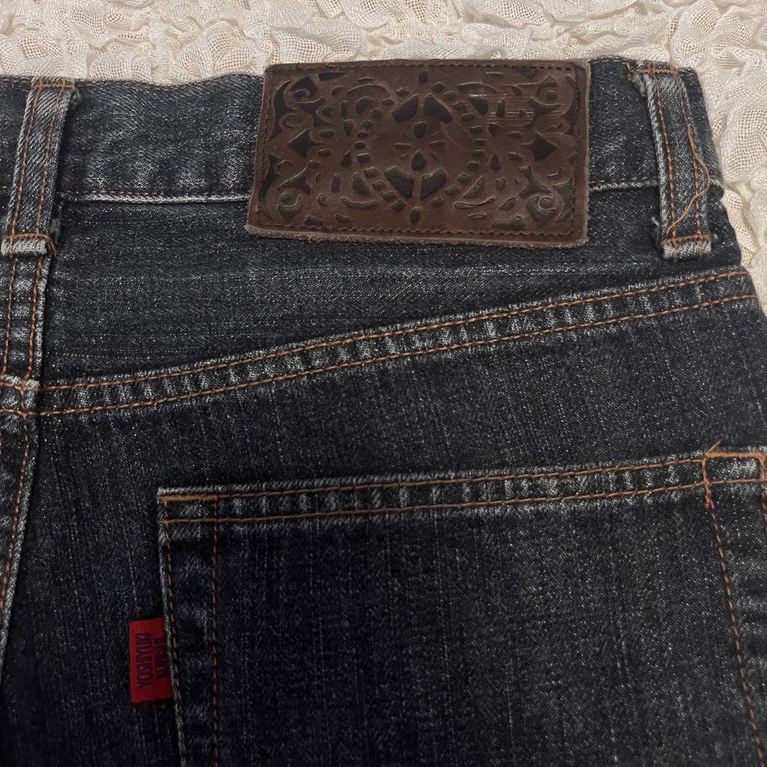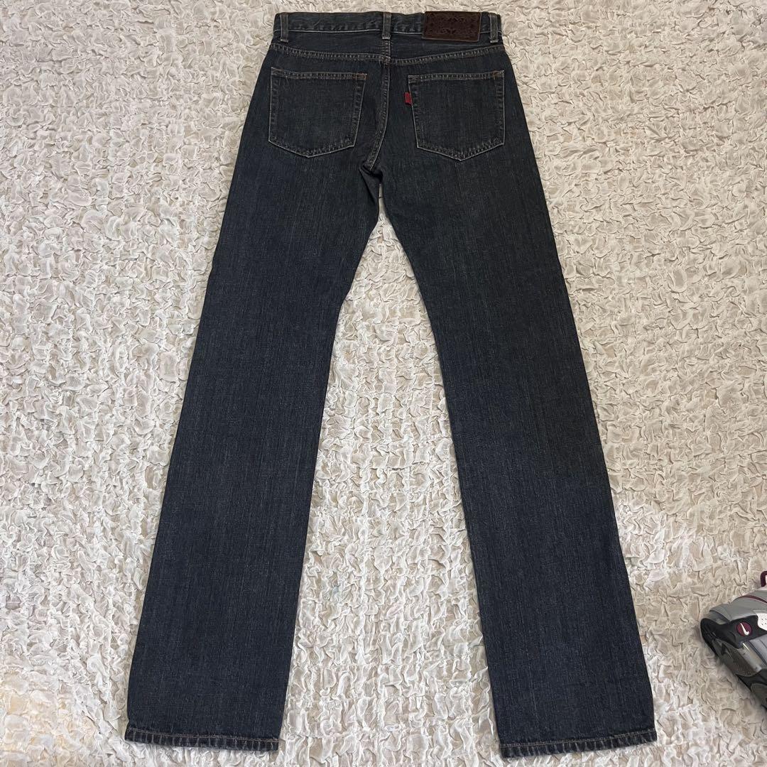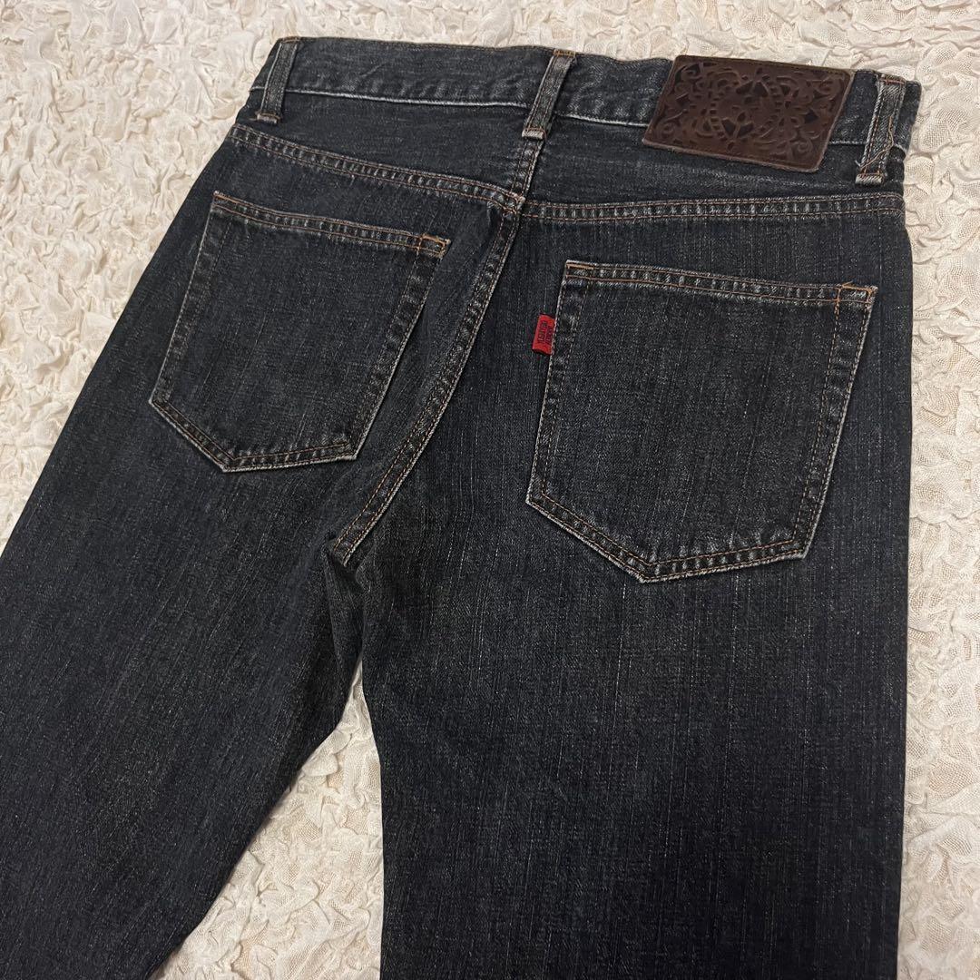 ■説明: ダークブルーのストレートジーンズ、希少なYOSHIKI KONISHI製、牛革パッチ付きです。スタイリッシュなデザインのデニムジーンズです。