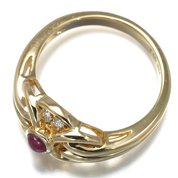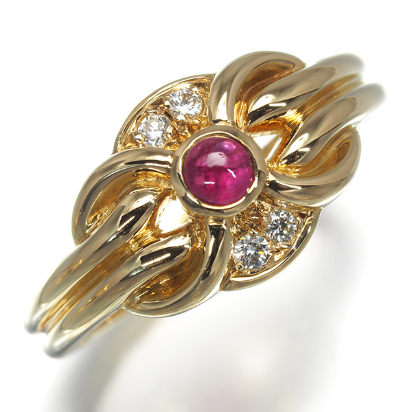 高貴な雰囲気を魅せるデザインで仕立てられたゴールドリングへ艶やかなカボションルビーと上質メレダイヤを留めたディオールのファインジュエリーです。 |