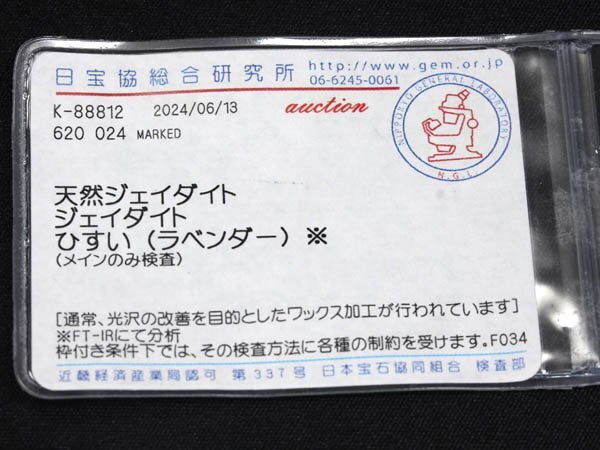 ◆安心の品質!!!【日宝協総合研究所】発行ソーティング付き!!! 樹脂含浸なし!!!天然ラベンダー翡翠 大粒6.2ctと極上ダイヤモンドを宝飾した、高級リングをご紹介いたします!!! こちらは気品溢れるラベンダーカラーに艶めく、大粒サイズの天然ラベンダー翡翠!!! 樹脂含浸なしの天然ラベンダー翡翠ならではの美しいお色と滑らかな艶を、大粒6.2ctの存在感と共にご堪能いただける大変魅力的なお品でございます!!! 両サイドのアーム部分には、透明感溢れる輝きを放つ極上ダイヤモンドを宝飾!!! 極上ダイヤの輝きが、大粒ラベンダー翡翠を引き立てています!!! 洗練されたエレガントなデザインには、高級素材Pt900を使用!!! プラチナの質感が、より一層の高級感を演出します!!! こちら格安での出品となっておりますので、この機会是非お見逃しなく!!! ◆こちらの商品はお客様の希望がある場合のみ、評価をつけております。 評価希望のお客様は、オーダーフォームの要望欄にてお知らせくださいませ。 |