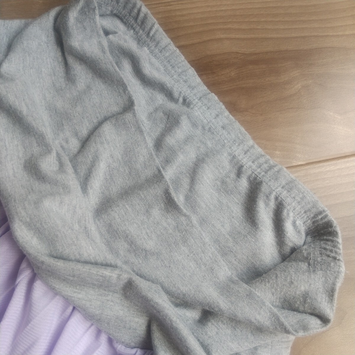 お洗濯によるしわや素材の特性上所々引っかけ傷が出来ています。グレーのカットソー生地に多少毛玉がありますが、特に目立つ汚れはありません。