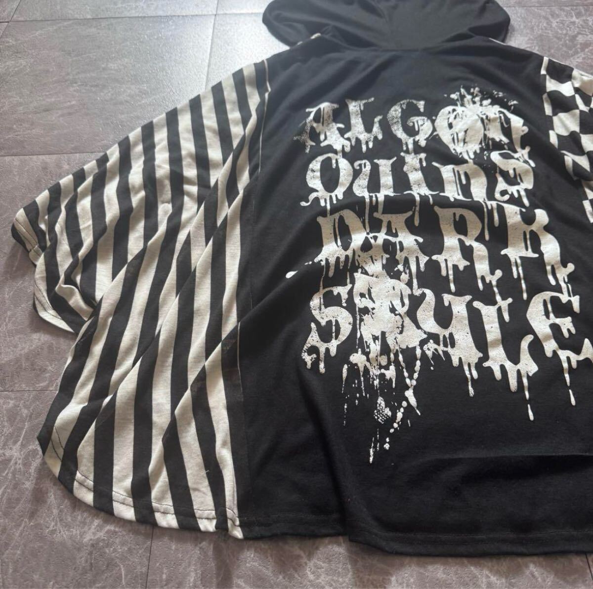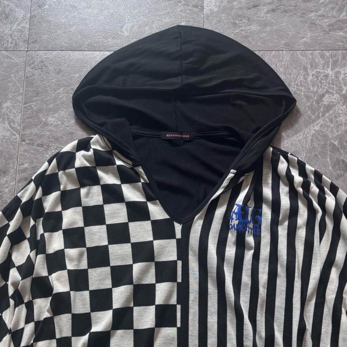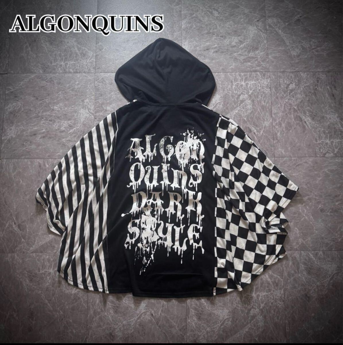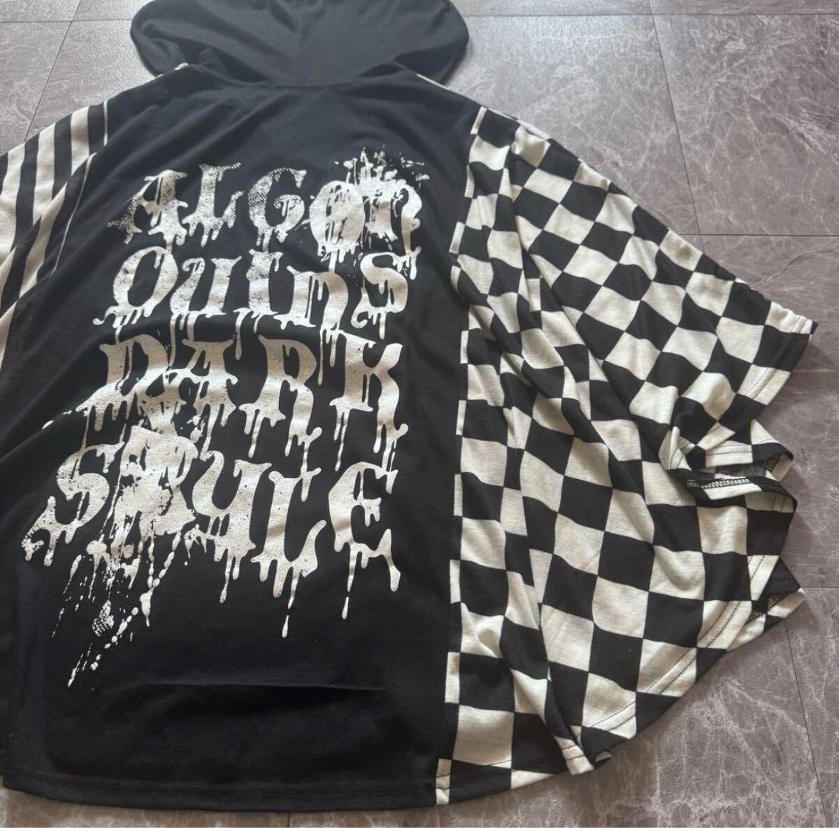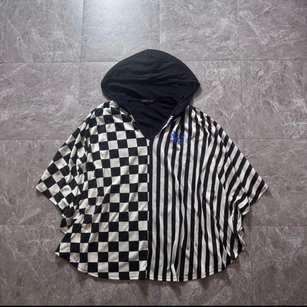 チェッカーパターンとストライプのデザインが特徴のマントフード付きポンチョ。