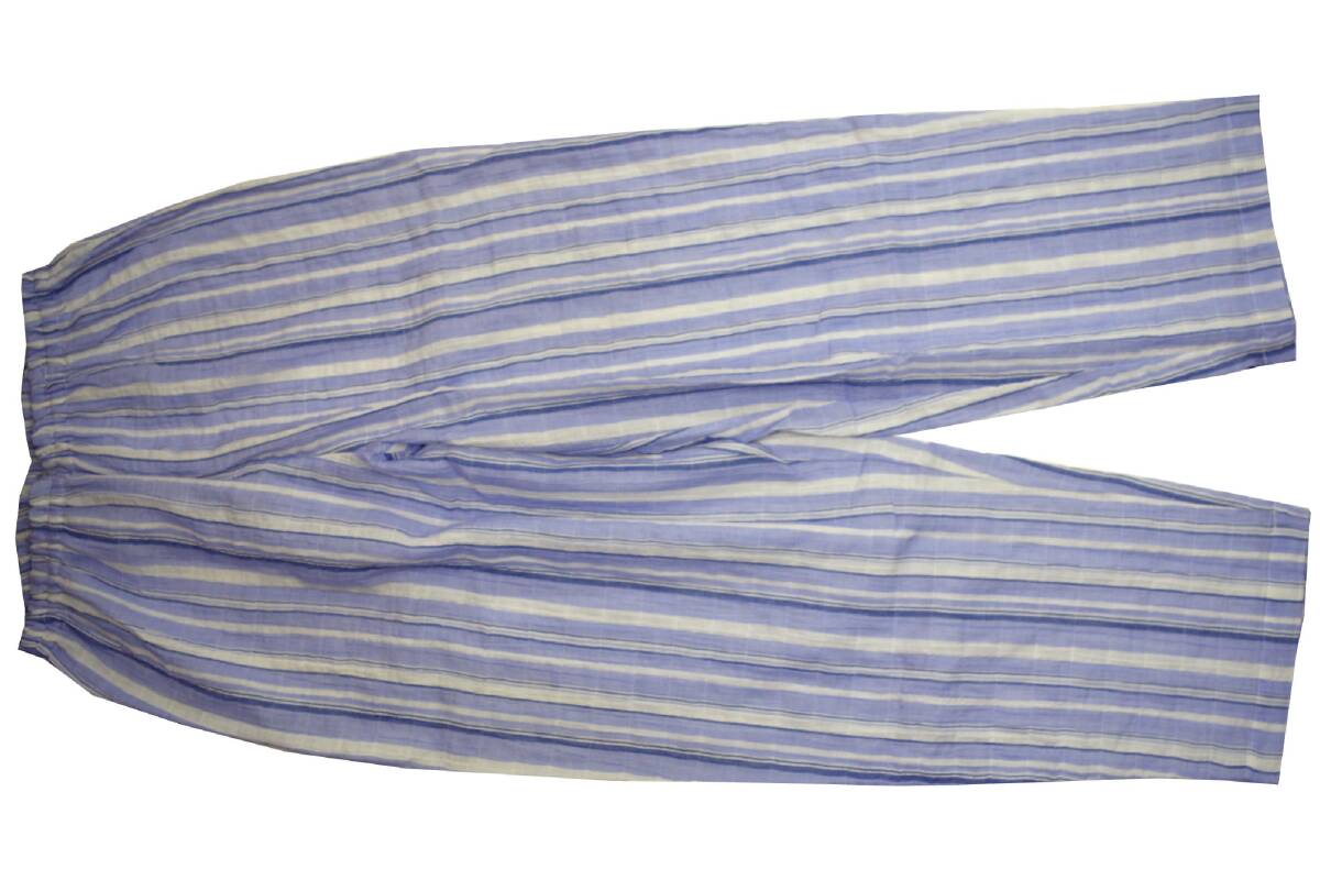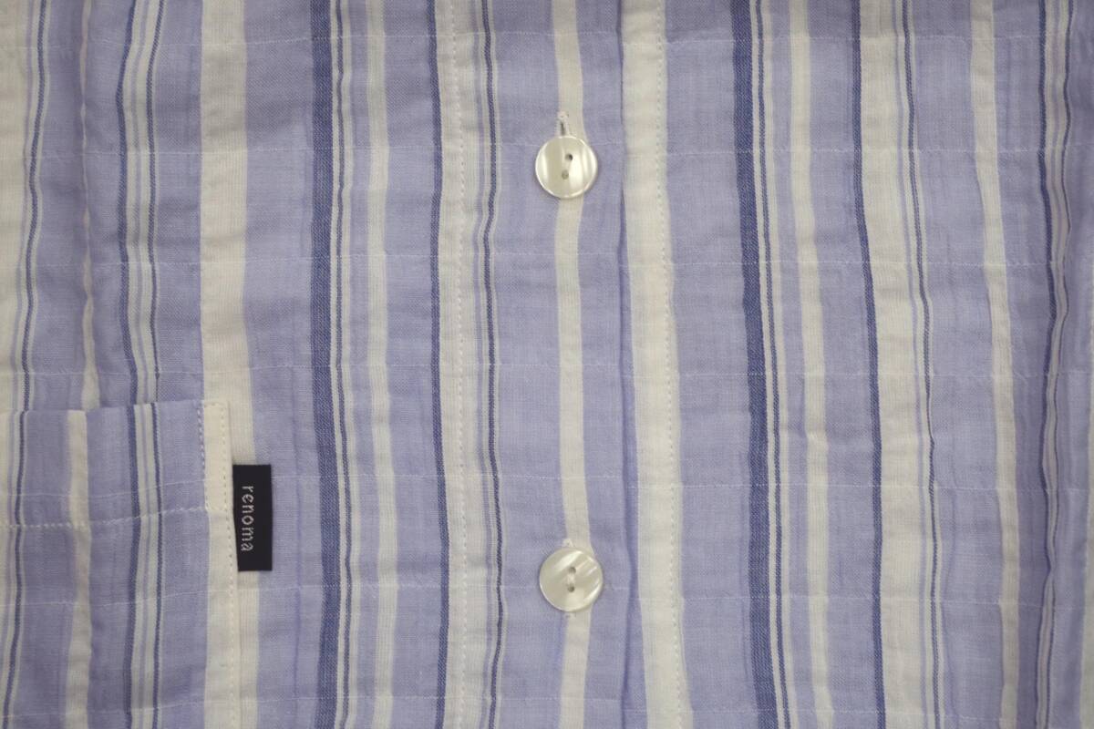レノマrenoma PARISの春夏物ダブルガーゼシャーリング加工パジャマ(M)、新品です。軽くてサラッとしたシャーリングならではの肌触りと柔らかさです。 前開き、7分袖、ロングパンツ。素材は綿99%、ポリウレタン1%。色はブルー。 サイズはMでバスト79-87㎝。正規ライセンス販売品です。