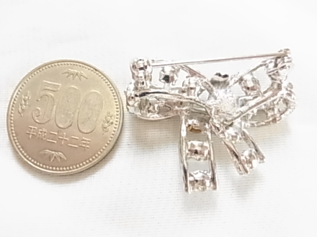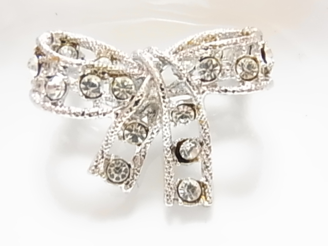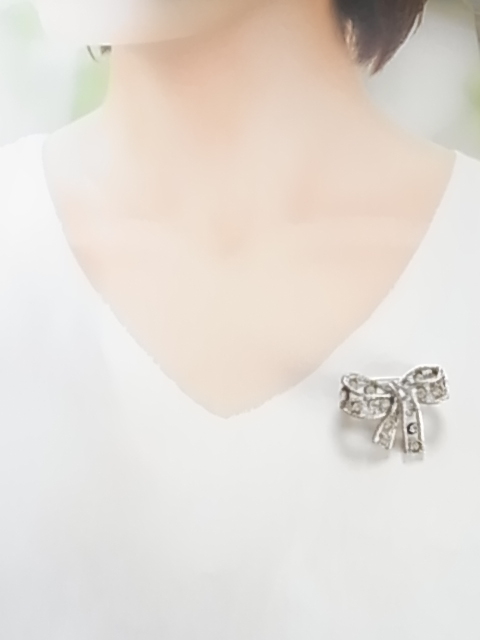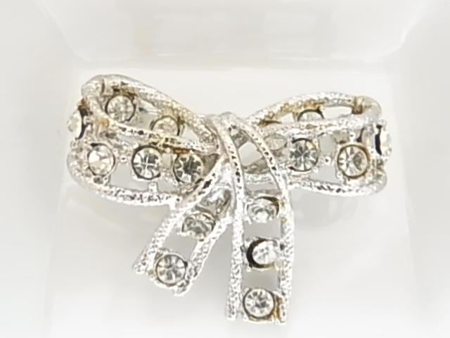 ▲ビンテージ/ヴィンテージ クリアラインストーンが輝くビジュー シルバートーン 銀色トーン りぼんモチーフ リボン 可愛いブローチ