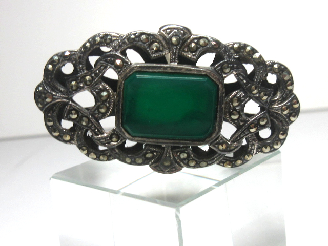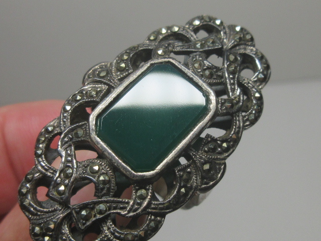 ~ ★アンティークリング「緑瑪瑙&マーカサイト」★指輪・スターリングシルバー925製・透かし彫り★ビンテージ・昭和レトロ・コレクション★ ~