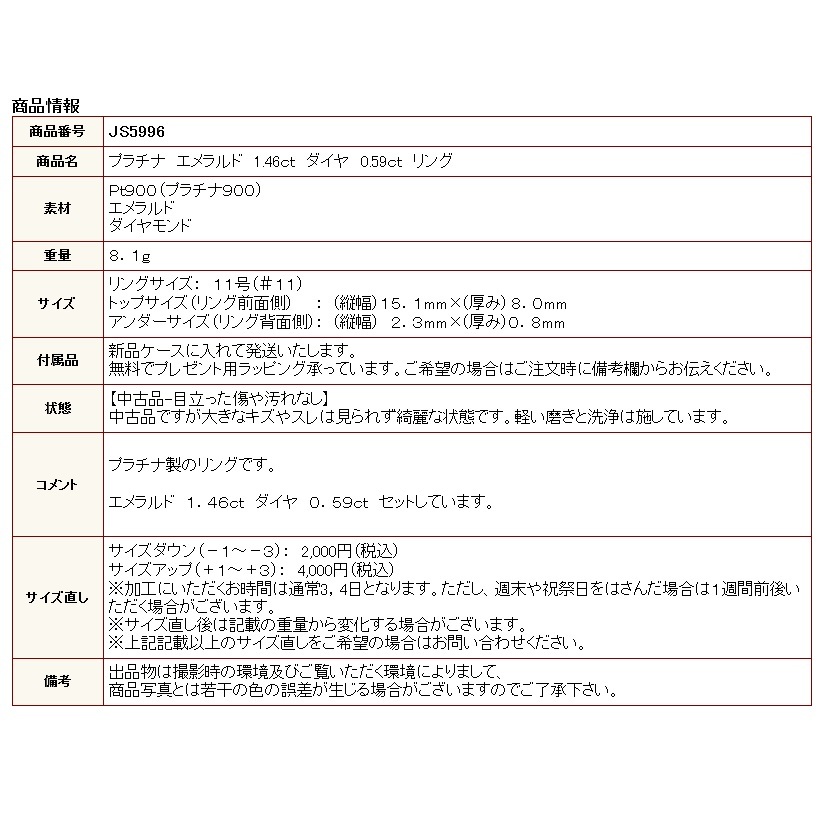 | 商品名 | プラチナ エメラルド 1.46ct ダイヤ 0.59ct リング |