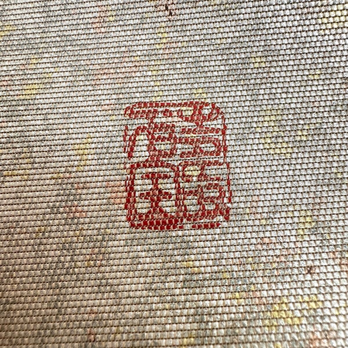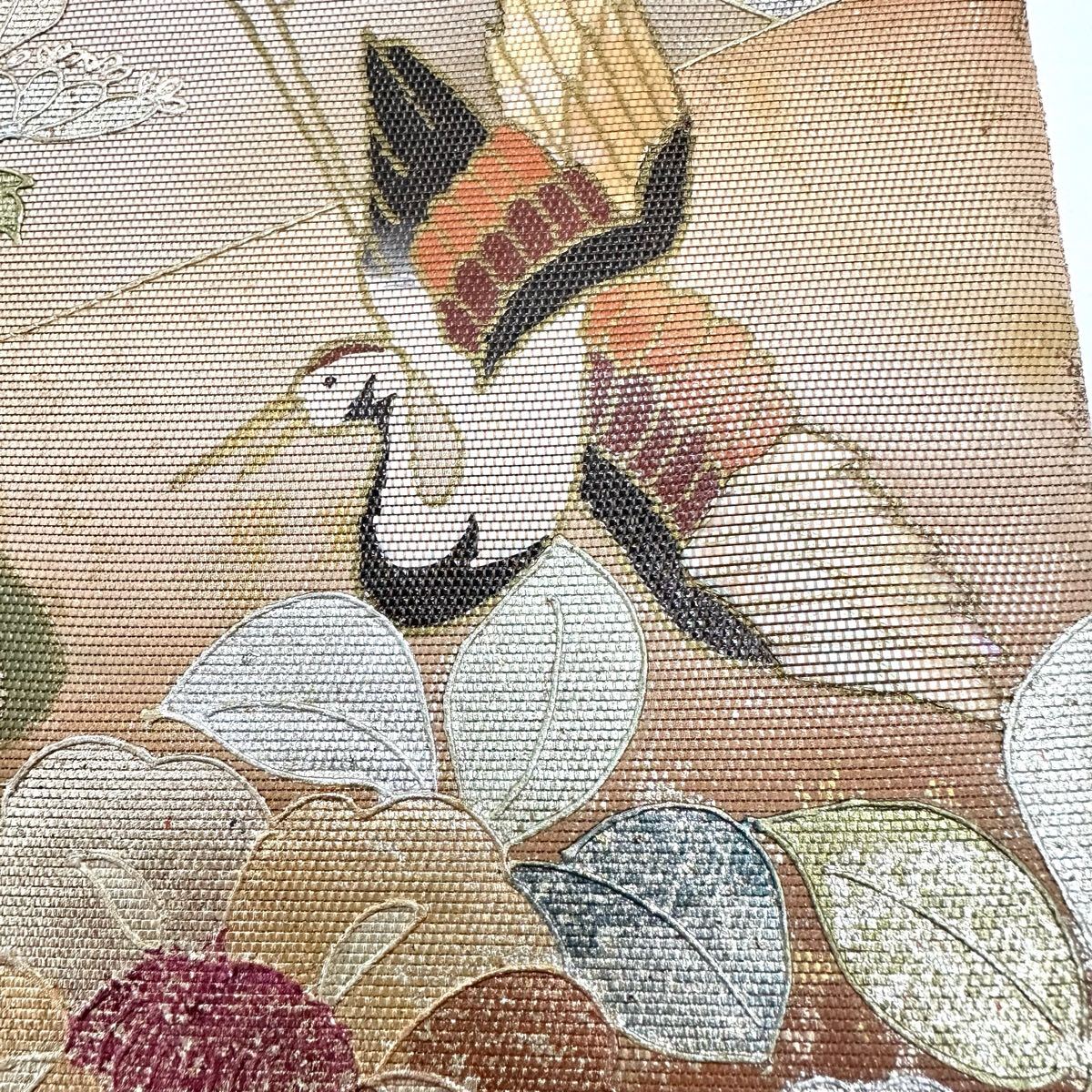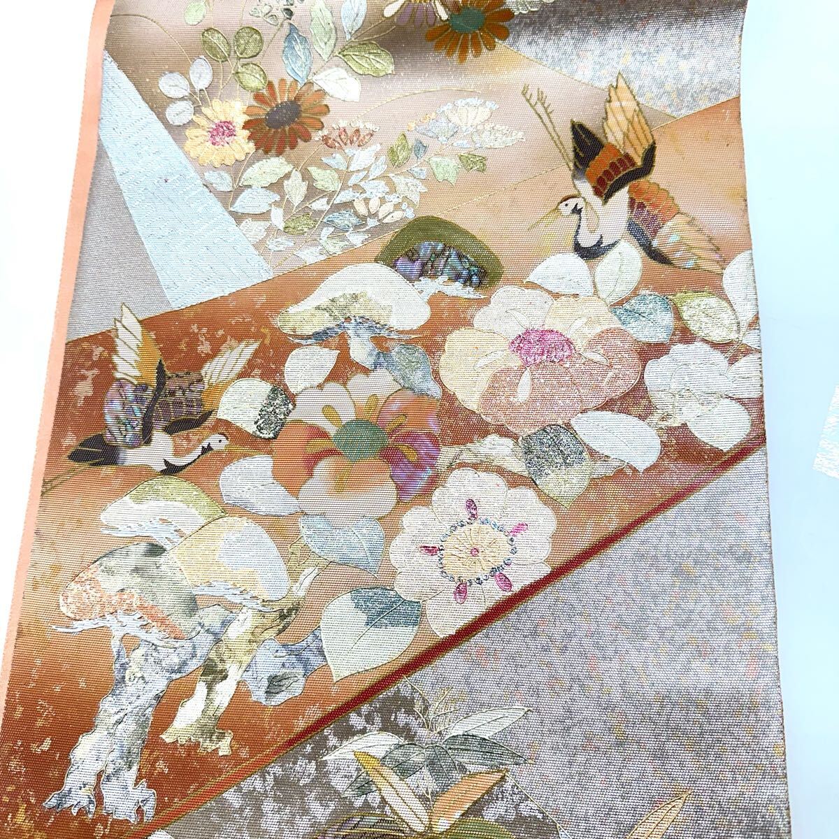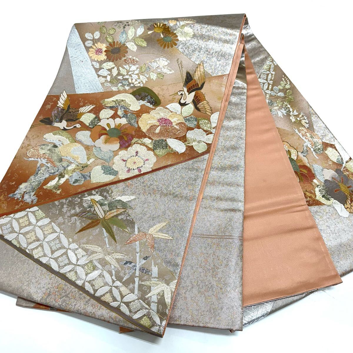 【七福】c608 逸品 高級品 正絹 袋帯 太鼓柄 螺鈿 落款 鶴 金糸 銀糸 豪華