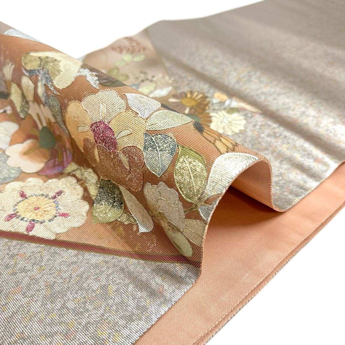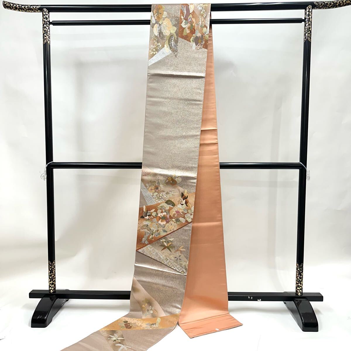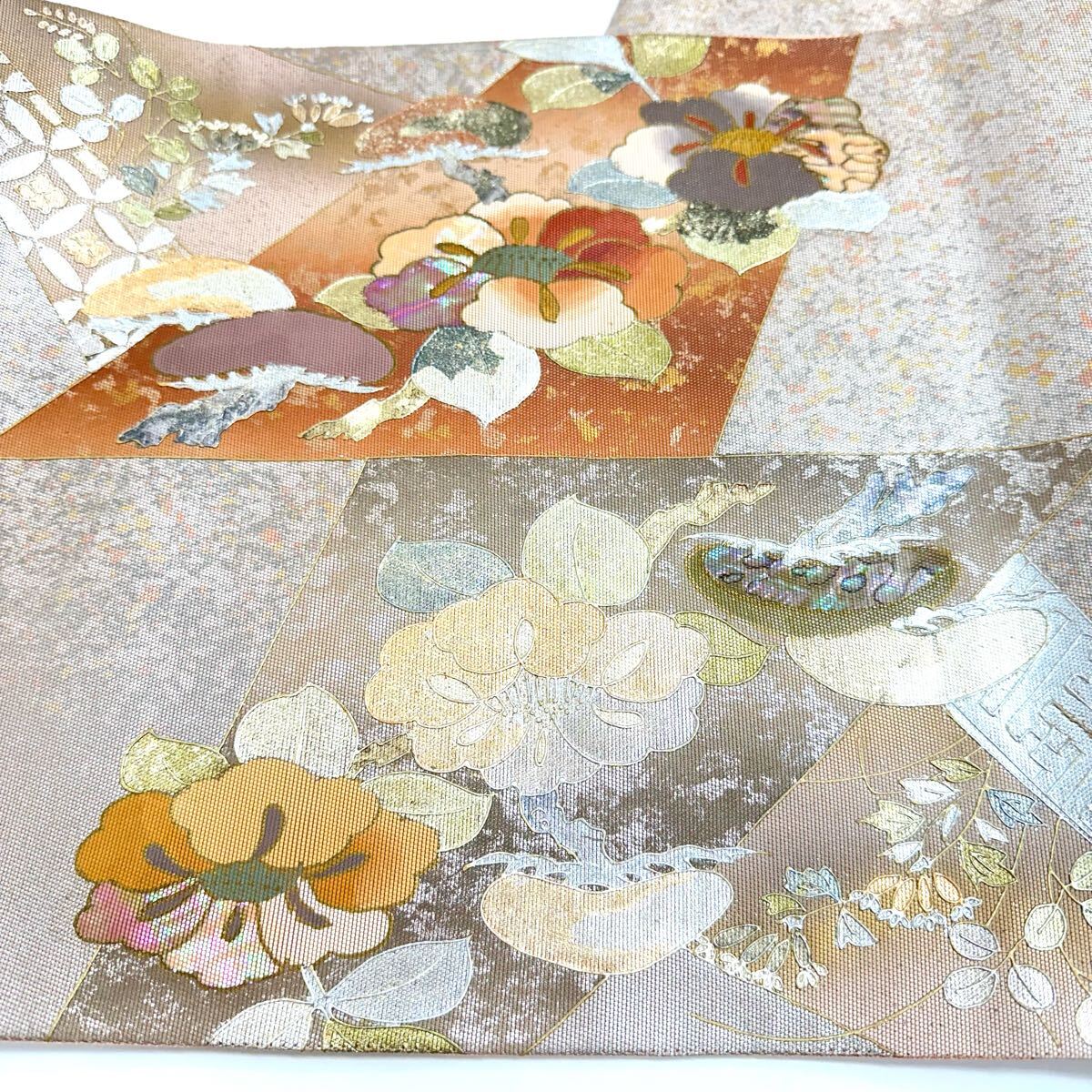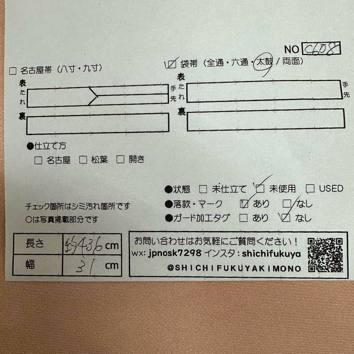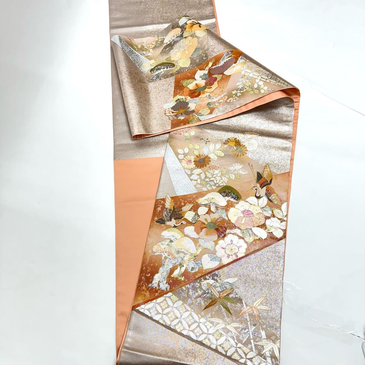 【七福】c608 逸品 高級品 正絹 袋帯 太鼓柄 螺鈿 落款 鶴 金糸 銀糸 豪華