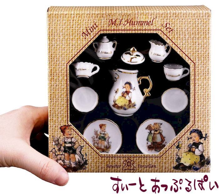 ドイツロイター社製のミニチュアティーセットです。本物の陶器製です。写真のような化粧箱に入っております。プレゼントや自分へのご褒美にぜひいかがでしょうか!箱のサイズ:152x152x40ミリ。スケールは約1/5です。お皿の直径約37ミリ。ティーポットの高さ約52ミリ。ティーポットのフタは接着されていません。シュガーポットのフタは接着されています。