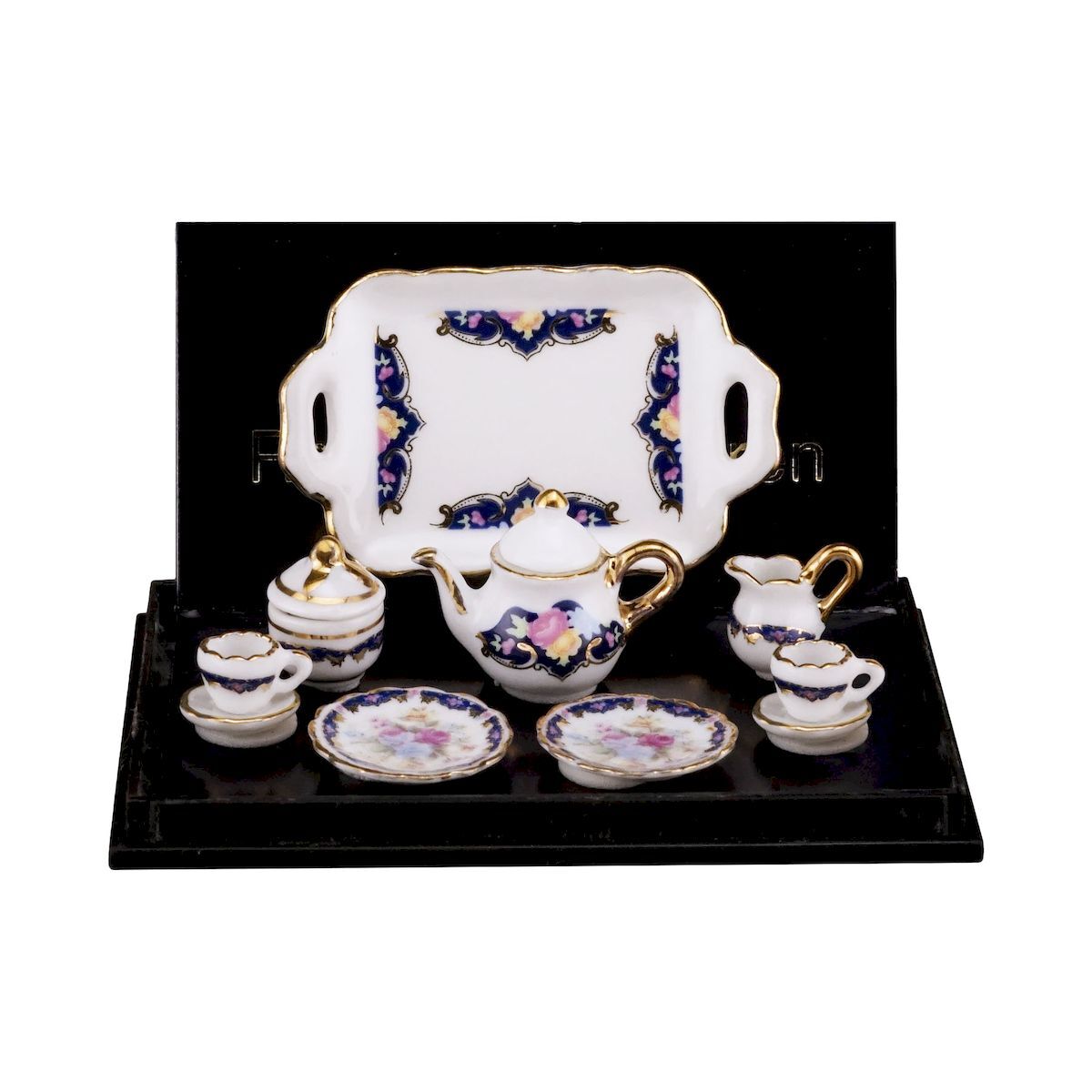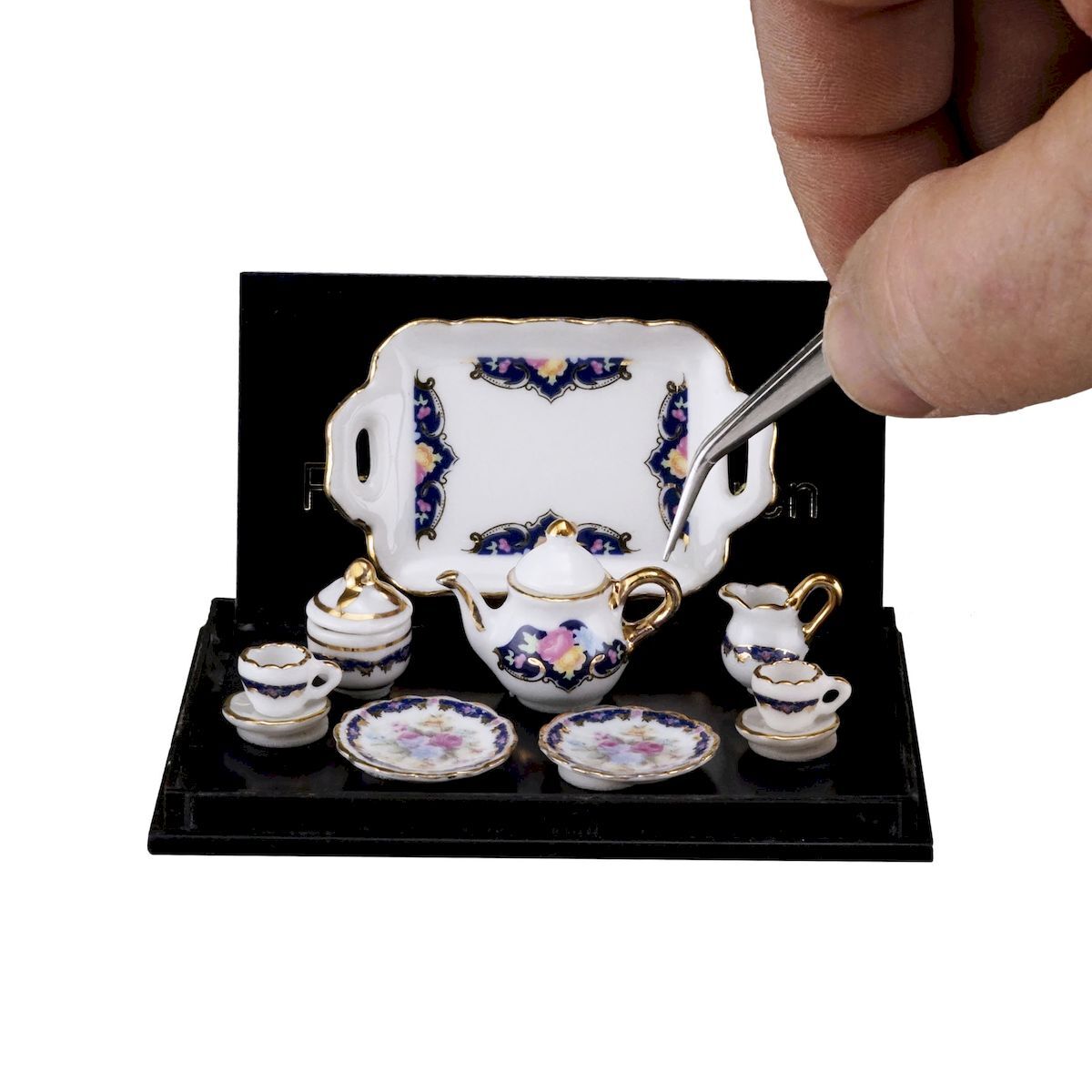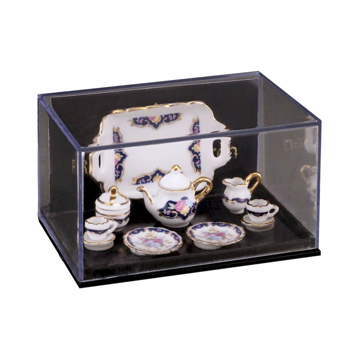 ドイツ ロイター社のミニチュアです。アクリルケース入りです。お皿の直径約20ミリ。ポットの蓋、カップとソーサーは接着されています。アクリルケースのサイズ:W80xD55xH48ミリ。