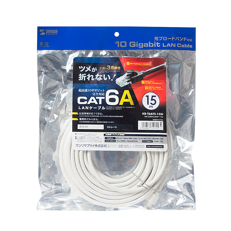 カテゴリ6A LANケーブル SANWA SUPPLY KB-T6ATS-15W 10GBASE-T 1000BASE-T CAT